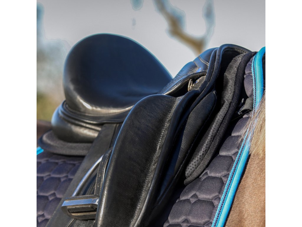 Podkładka pod siodło z pianką memory, zapewniający doskonały rozkład nacisku i amortyzację wstrząsów. Górna strona podkładki jest wyposażona w siatkę 3D, która zapewnia doskonałą oddychalność. Jej anatomiczny kształt zapobiega naciskowi na kręgosłup i kłąb.