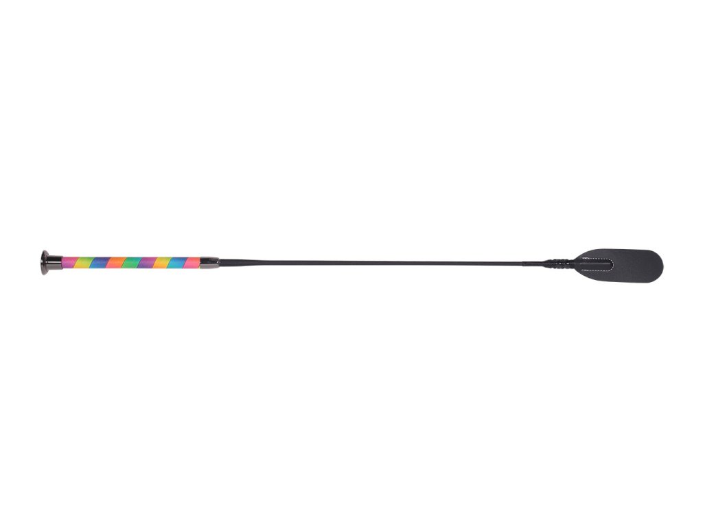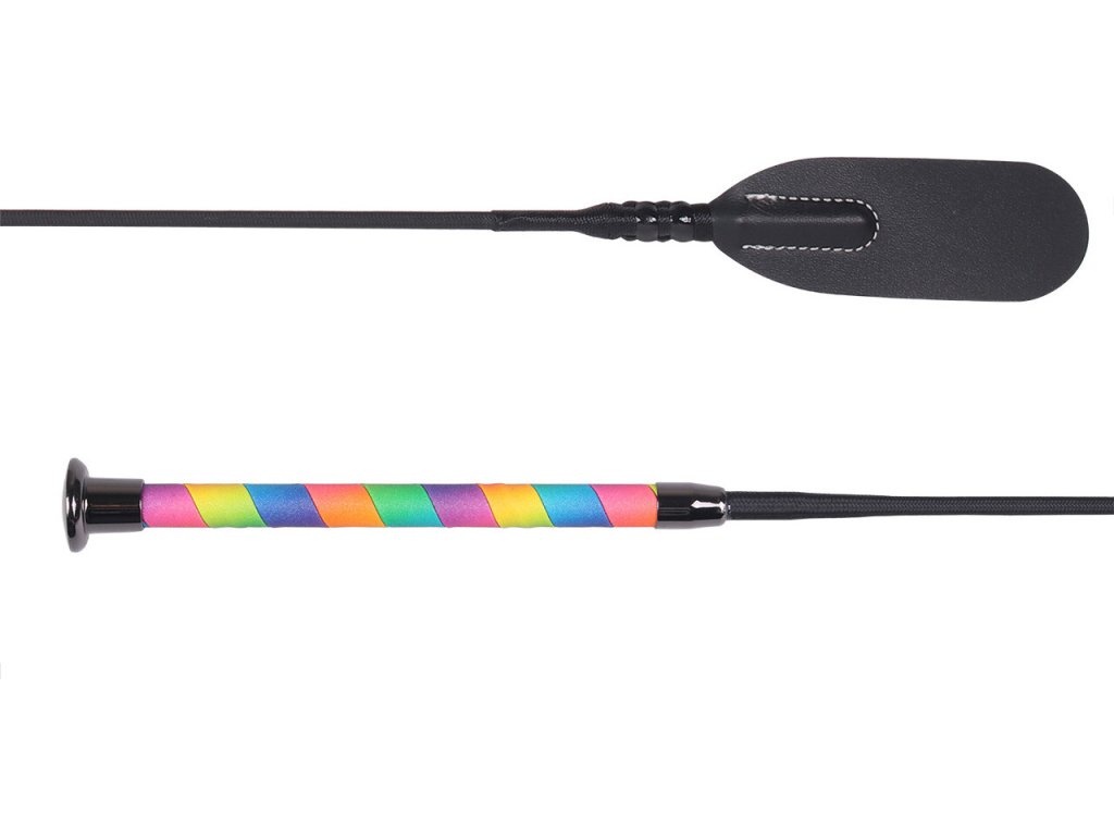Bat skokowy Ombre z kolorową rączką ze sztucznej skóry. Bat jest wyposażony w metalową końcówkę zapewniającą wygodny chwyt. Długość bata wynosi 65 cm. Ze względu na duży rozmiar bat nie może być wysłany pocztą.
