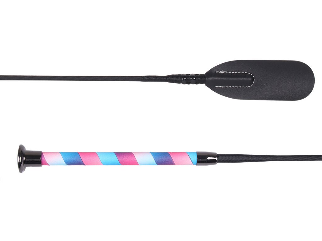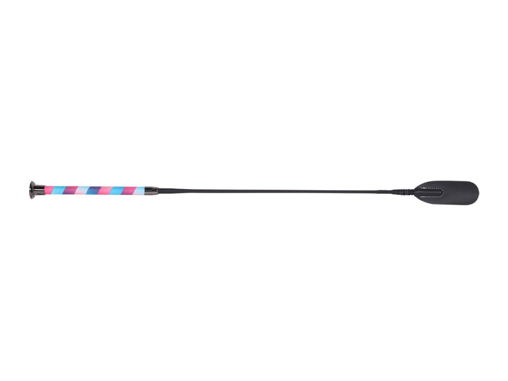 Bat skokowy Ombre z kolorową rączką ze sztucznej skóry. Bat jest wyposażony w metalową końcówkę zapewniającą wygodny chwyt. Długość bata wynosi 65 cm. Ze względu na duży rozmiar bat nie może być wysłany pocztą.