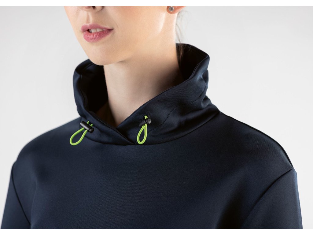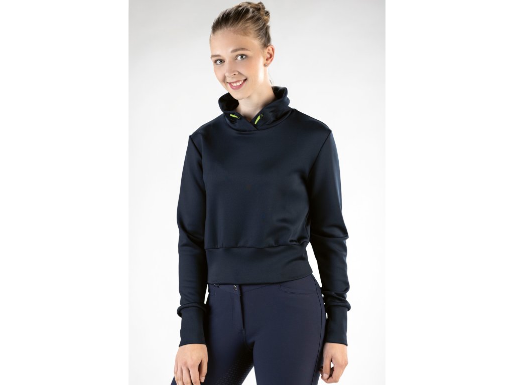 Krótka bluza damska wykonana z wysoce komfortowego i oddychającego materiału. Wyposażona w kaptur ze sznurkiem i szeroką gumkę w pasie i na rękawach. Dostępna w kolorze czarnym, niebieskim i zielonym.