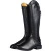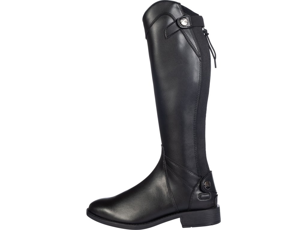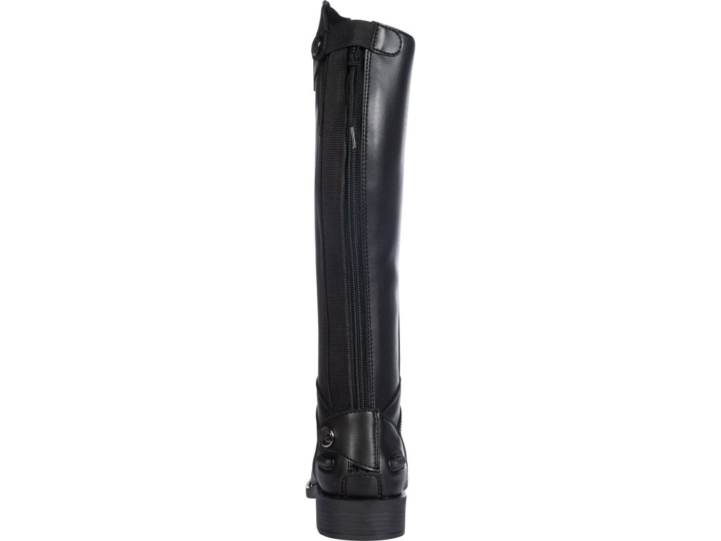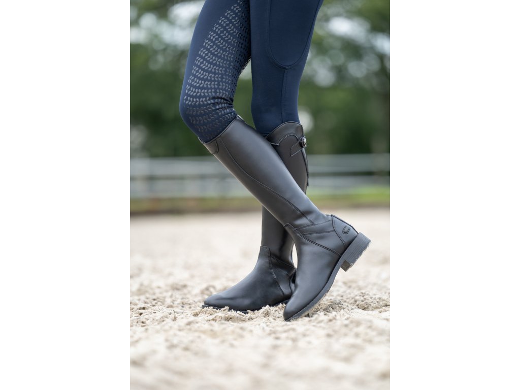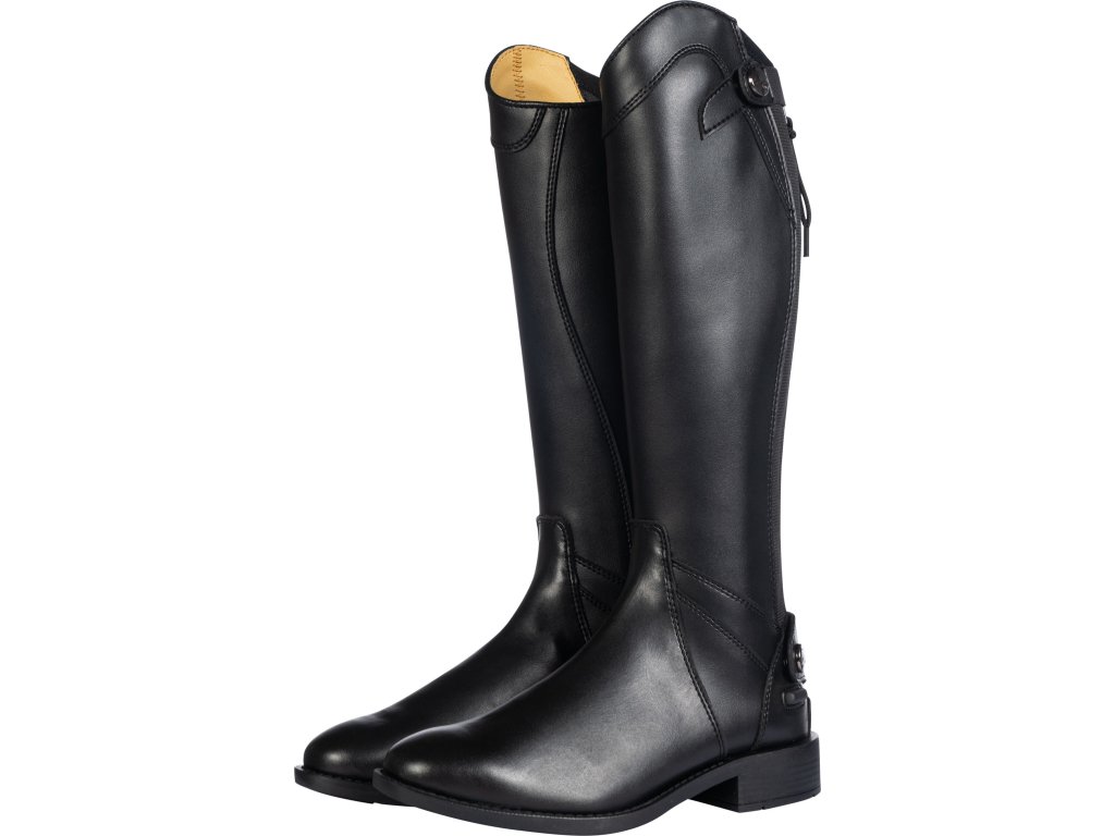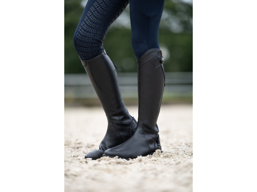 Wysokiej jakości buty jeździeckie wykonane ze skóry ekologicznej. Gwarantują maksymalny komfort. Wyposażone w zapięcie na zamek błyskawiczny z tyłu, zabezpieczone zatrzaskami na górze i na dole. Wzdłuż zamka błyskawicznego znajduje się elastyczny panel, dzięki któremu dopasowują się niemal jak buty szyte na miarę. Posiadają podpórki na ostrogi i syntetyczne podeszwy. Odpowiednie dla węższej łydki i standardowej nogi.