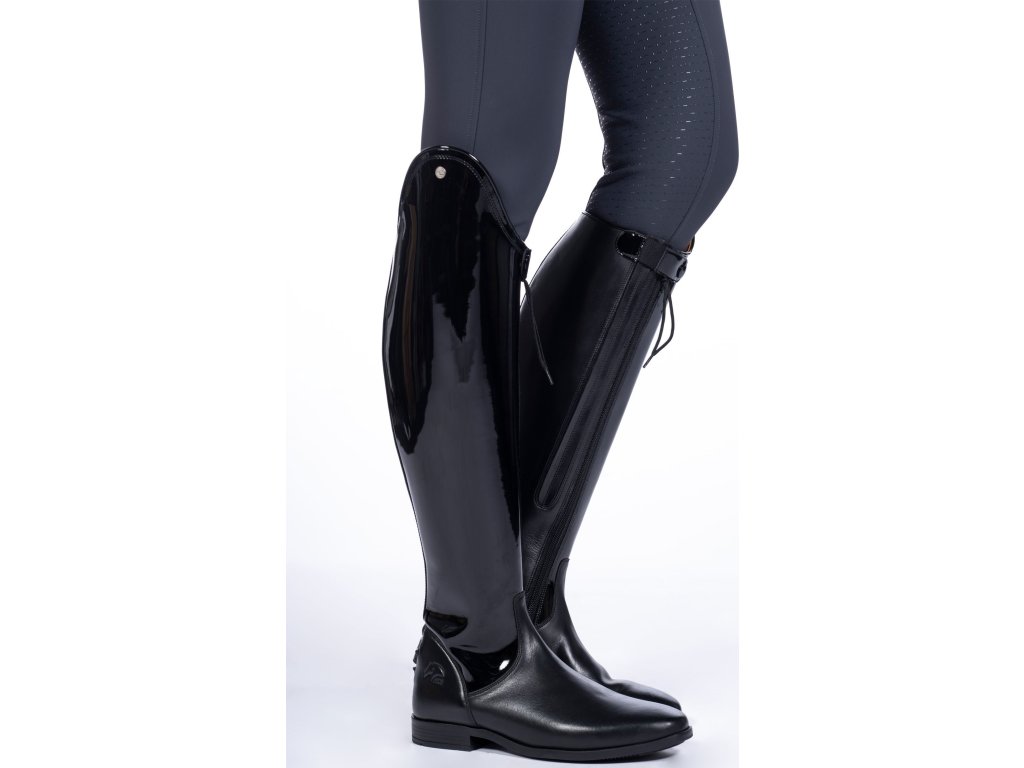 Wysokiej jakości buty jeździeckie o smukłym wyglądzie. Wykonane ze skóry lakierowanej. Wkładka z pianką memory foam gwarantuje maksymalny komfort. Wyposażone w boczny zamek błyskawiczny z zapięciem na zatrzask. Wzdłuż zamka znajduje się elastyczna część, która zapewnia idealne dopasowanie. Wyposażone w syntetyczną podeszwę i podpórki na ostrogi. Łatwe do czyszczenia wilgotną szmatką; nie zaleca się stosowania kremu ani pasty do butów. Buty są odpowiednie dla wąskiej i wysokiej łydki.