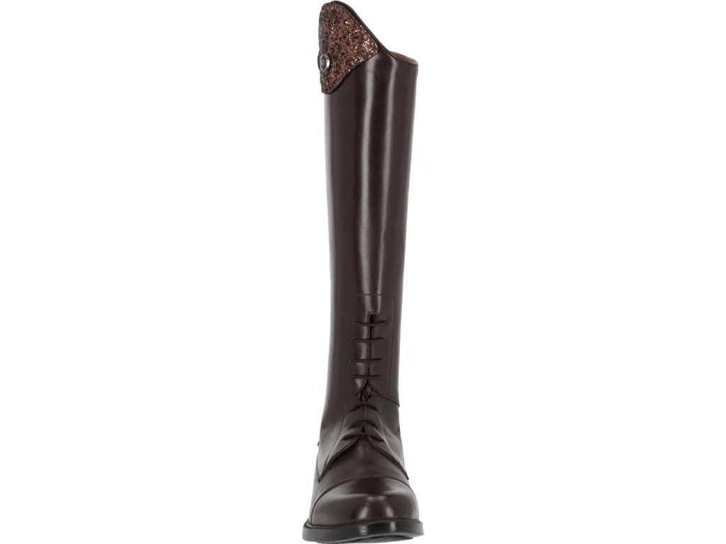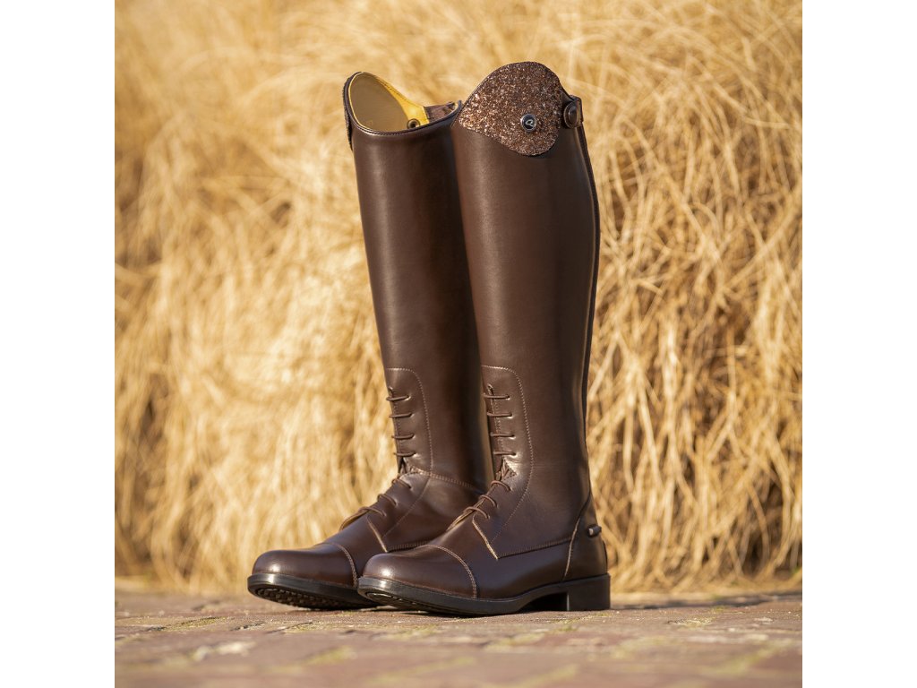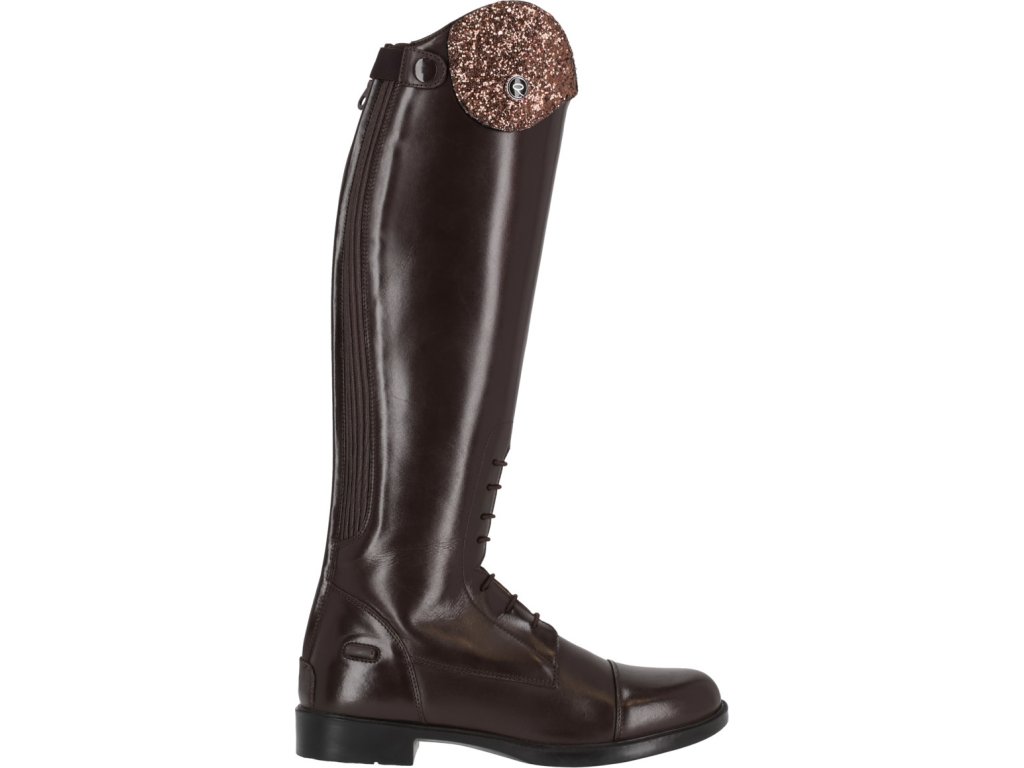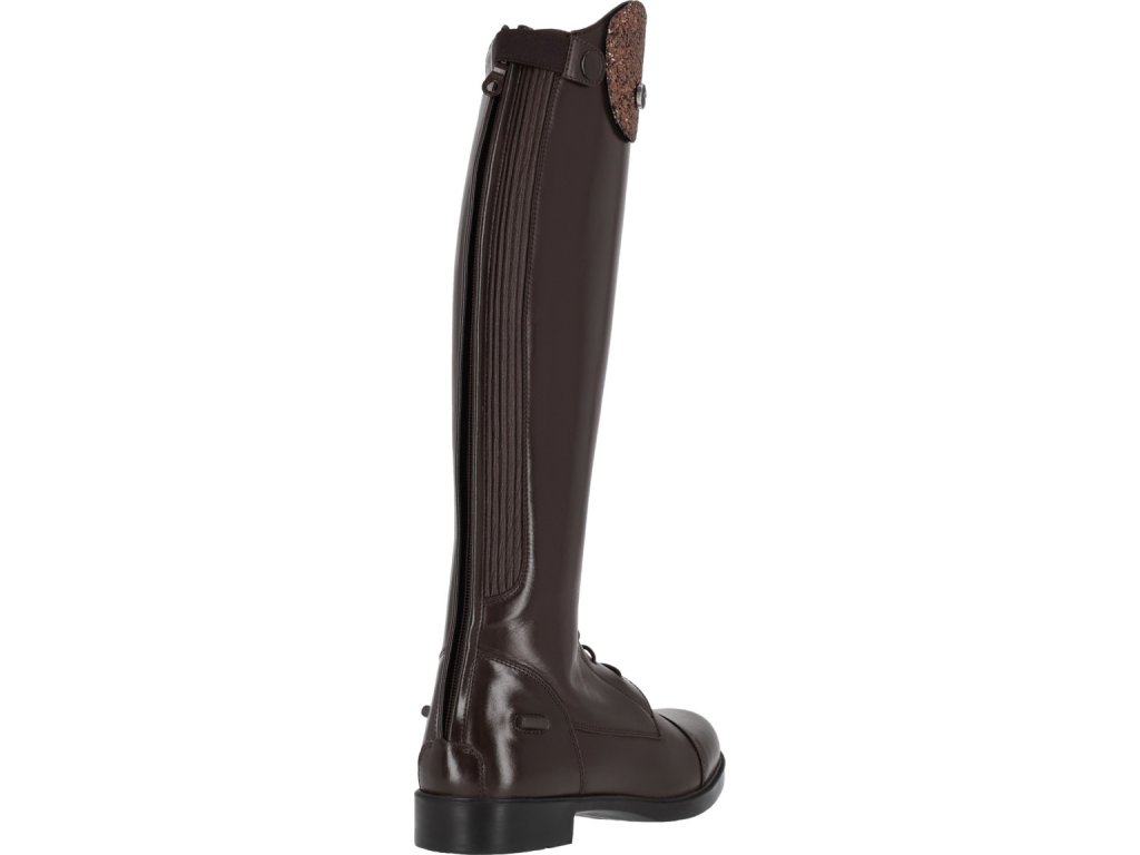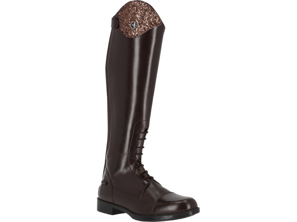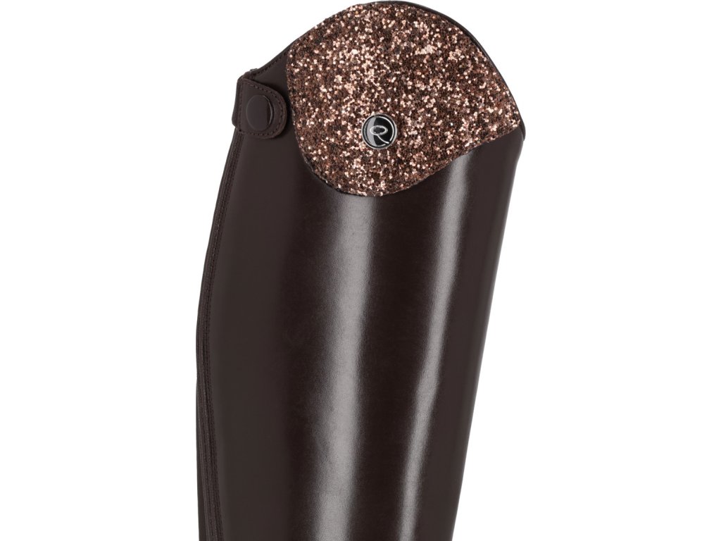 Długie buty jeździeckie dla juniorów wykonane ze skóry bydlęcej wysokiej jakości, łączące elegancję i praktyczność. Dzięki błyszczącemu elementowi dekoracyjnemu w górnej części buta, jeźdźcy mogą łatwo dostosować swoje buty do własnego stylu. Podstawowy element dekoracyjny jest dołączony, a inne warianty można kupić oddzielnie. Buty są wyposażone w tylny zamek błyskawiczny z ochroną i podpórki na ostrogi. Przednie sznurowanie nadaje butom elegancki wygląd.