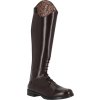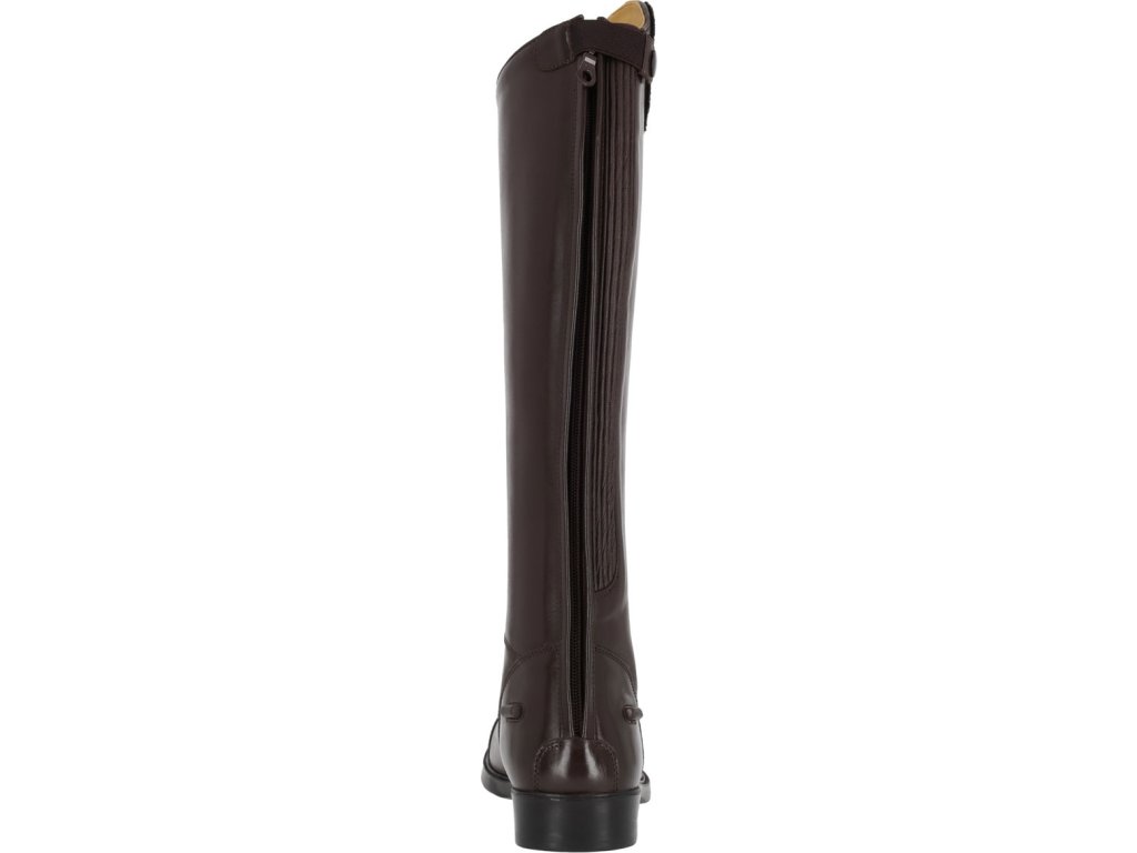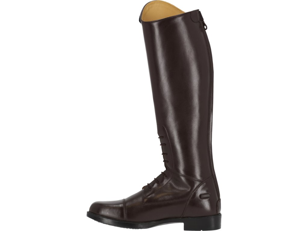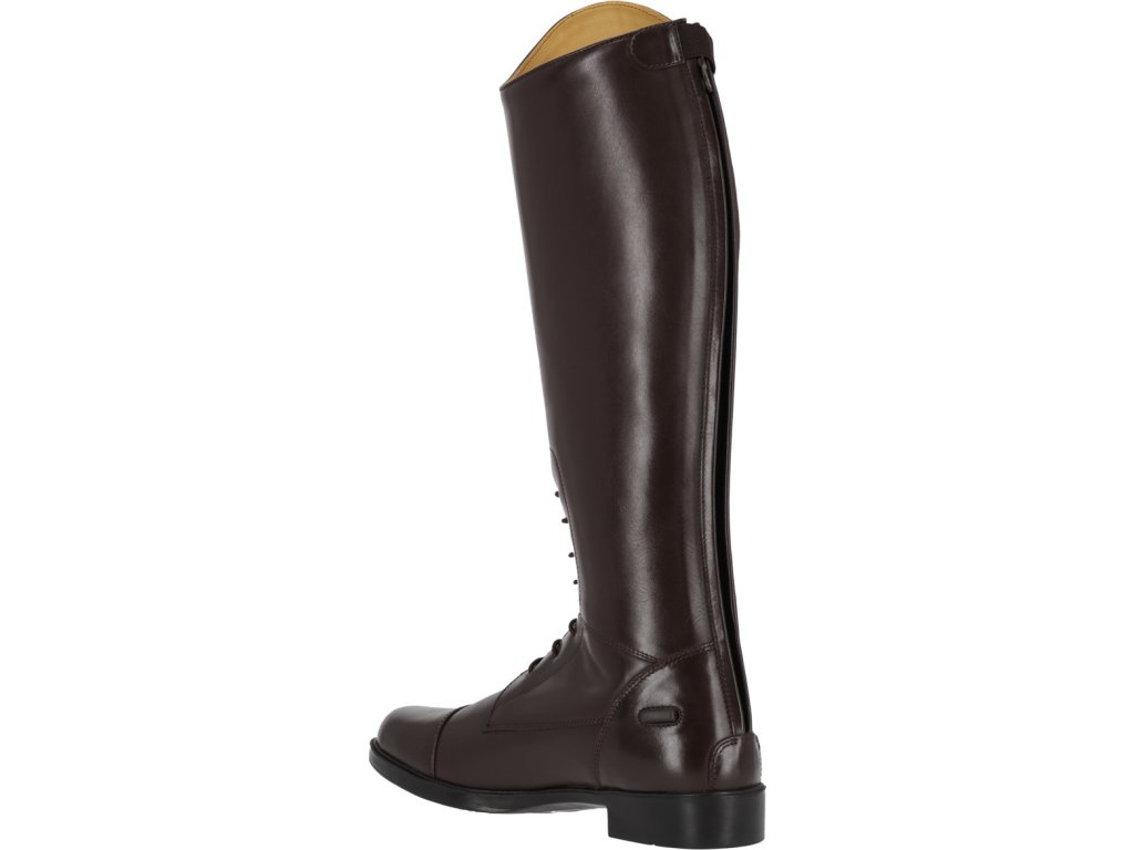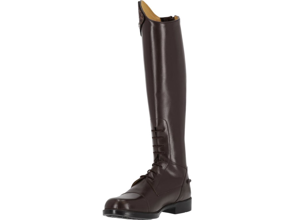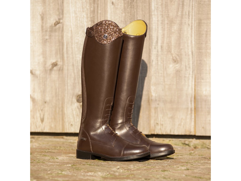 Długie buty jeździeckie dla juniorów wykonane ze skóry bydlęcej wysokiej jakości, łączące elegancję i praktyczność. Dzięki błyszczącemu elementowi dekoracyjnemu w górnej części buta, jeźdźcy mogą łatwo dostosować swoje buty do własnego stylu. Podstawowy element dekoracyjny jest dołączony, a inne warianty można kupić oddzielnie. Buty są wyposażone w tylny zamek błyskawiczny z ochroną i podpórki na ostrogi. Przednie sznurowanie nadaje butom elegancki wygląd.