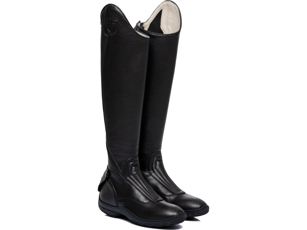 Wysokiej jakości buty jeździeckie z wygodną wyściółką. Wykonane z miękkiej skóry bawolej. Wysokiej jakości materiały zapewniają butom niezrównaną trwałość, przyczepność i oferują jeźdźcowi doskonały kontakt z koniem. Wyposażone w zapięcie na zamek błyskawiczny z tyłu na całej długości, zabezpieczone na górze i na dole zatrzaskiem. Oparcia na ostrogi są w trzech pozycjach. Wyposażone w sportową podeszwę odporną na ścieranie, lekką, antypoślizgową i amortyzującą. Ozdobiony logo Equestro. Odpowiednie dla goleni o szerokości M. Dla każdego rozmiaru można wybrać wysokość buta - niską, standardową i wysoką.