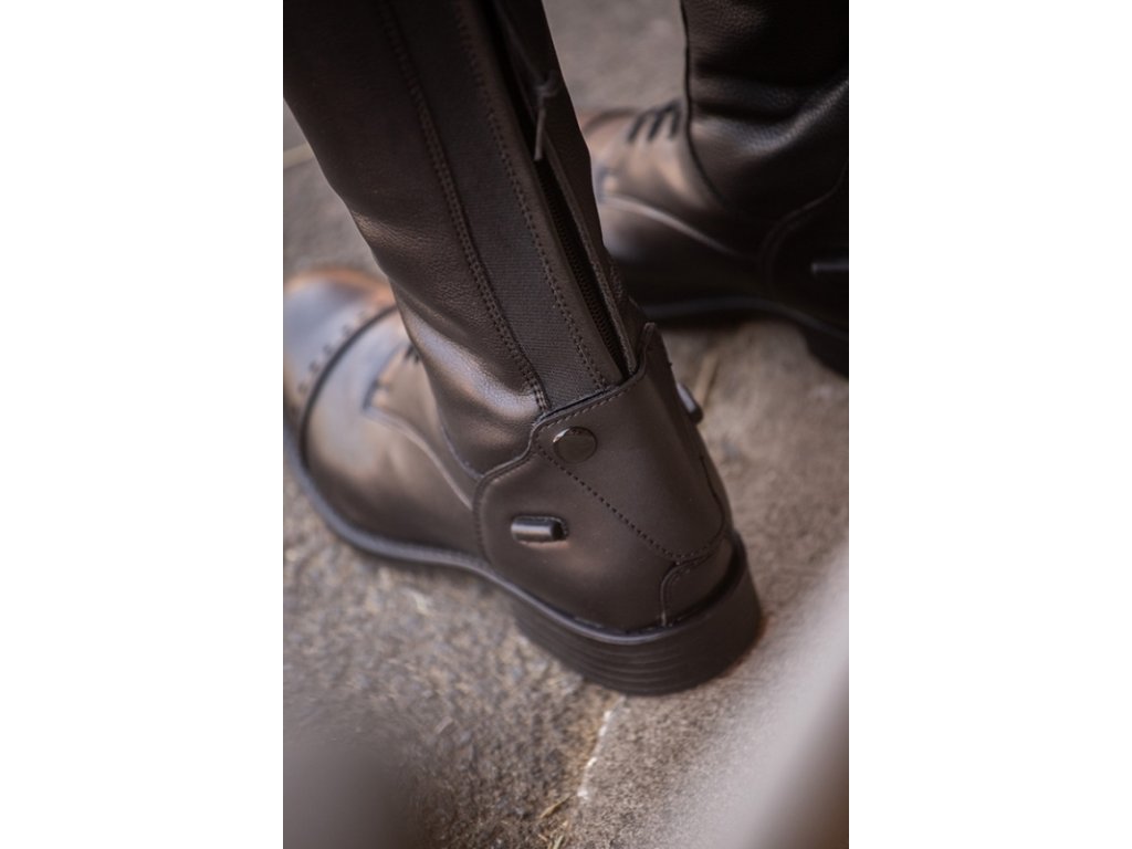 Dziecięce długie buty jeździeckie Softy oferują wyjątkowy komfort i swobodę ruchów dzięki elastycznemu materiałowi w obszarze łydki i podbicia. Wykonane są z materiałów syntetycznych, ale jednocześnie zachowują elegancki wygląd. Styl podkreśla błyszczący, lakierowany detal u góry z logo Penelope i delikatna ozdobna aplikacja na palcach. Buty zapinane są z tyłu na solidny zamek błyskawiczny, który jest zabezpieczony zatrzaskami na górze i na dole.