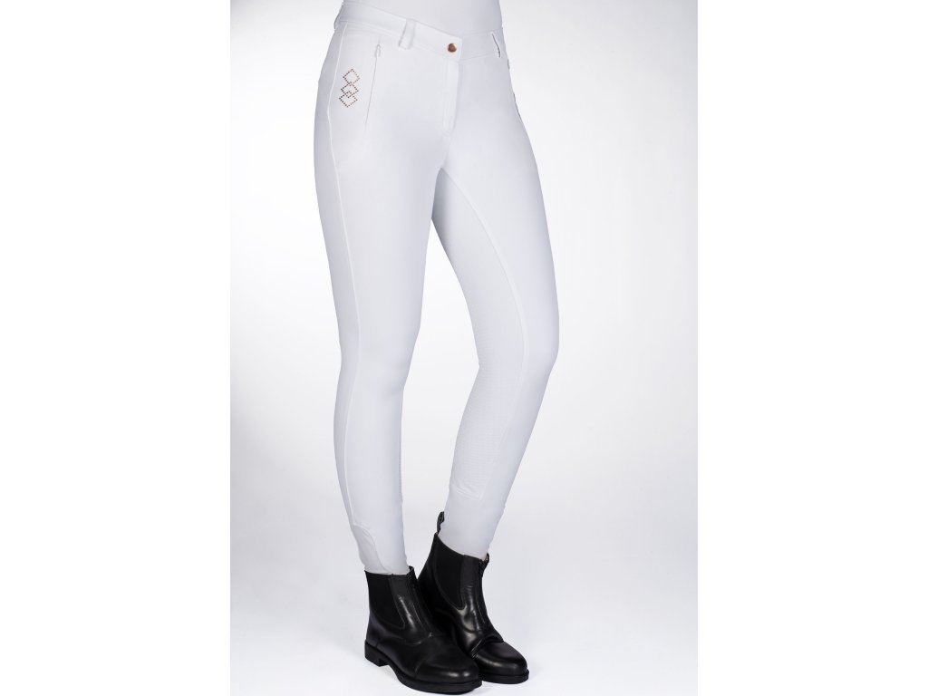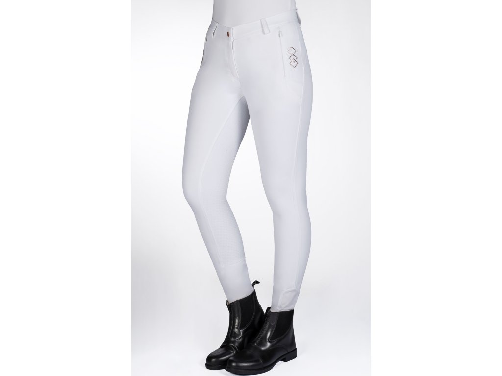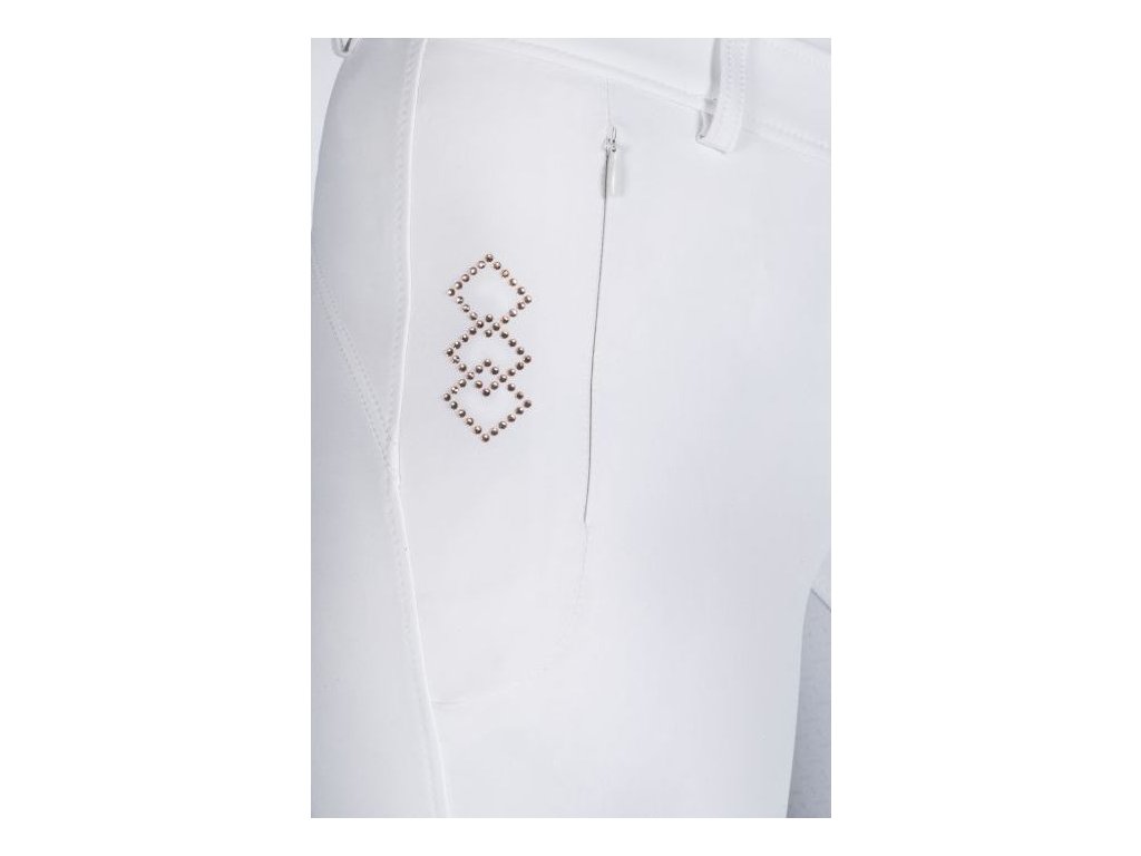 Bryczesy jeździeckie z antypoślizgowym silikonowym lejem na całym siedzisku. Są elastyczne i oddychające jednocześnie. Posiadają elastyczny panel na dole nogawki ułatwiający zakładanie oraz kieszeń na zamek. Są wyposażone w szlufki na pasek. Po bokach ozdobione są kryształkami. Można prać w pralce w temperaturze 30 stopni.