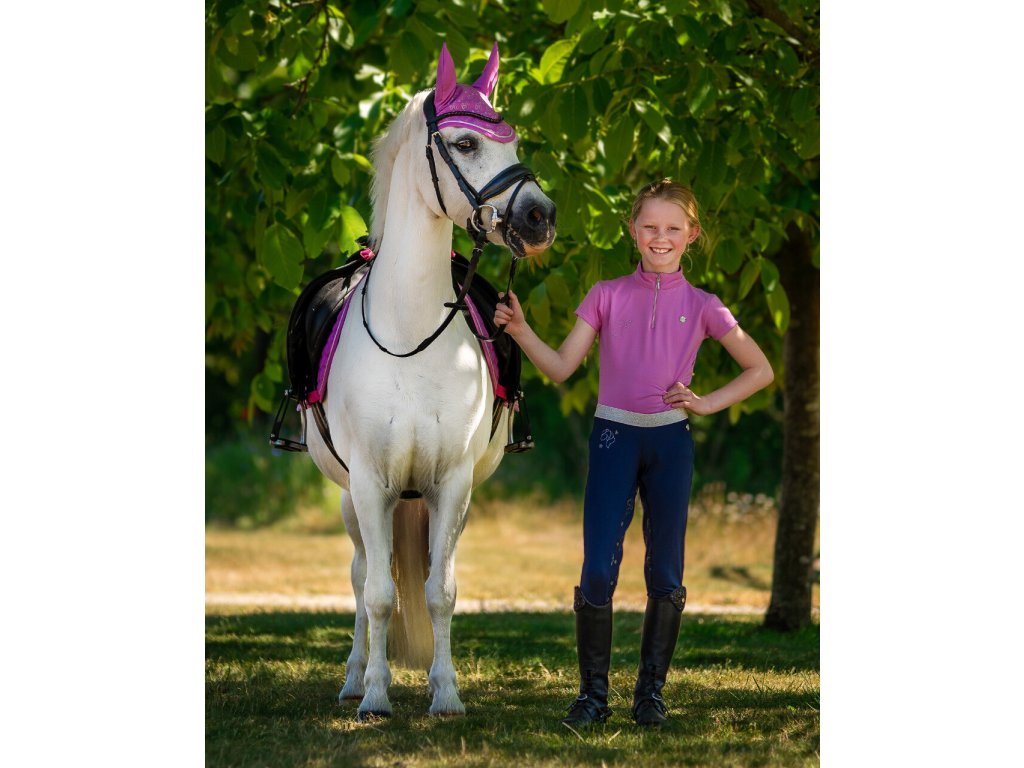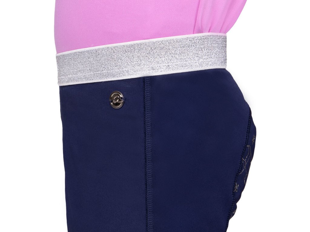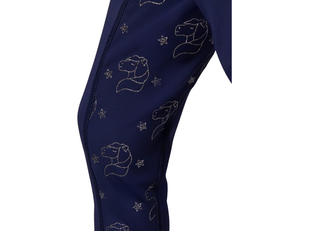 Wysokiej jakości dziecięce bryczesy wykonane z elastycznego, miękkiego materiału, który zapewnia maksymalny komfort. Legginsy do jazdy konnej posiadają silikonowe, antypoślizgowe elementy w kształcie jednorożców oraz wygodny pas z gumką. Ozdobione brokatową gumką w pasie i jednorożcem po prawej stronie. Bryczesy do jazdy konnej są również dostępne w kolorze różowym. Idealnie pasują do innych produktów z kolekcji Gwenn.