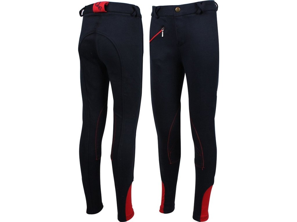 Podstawowe bryczesy z naszywkami na kolanach, bardzo wygodne w noszeniu dzięki bawełnianemu materiałowi i elastycznemu pasowi, nogawki wykończone Lycrą, przednia kieszeń na zamek błyskawiczny.