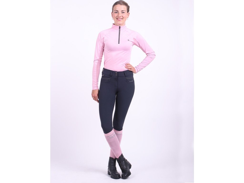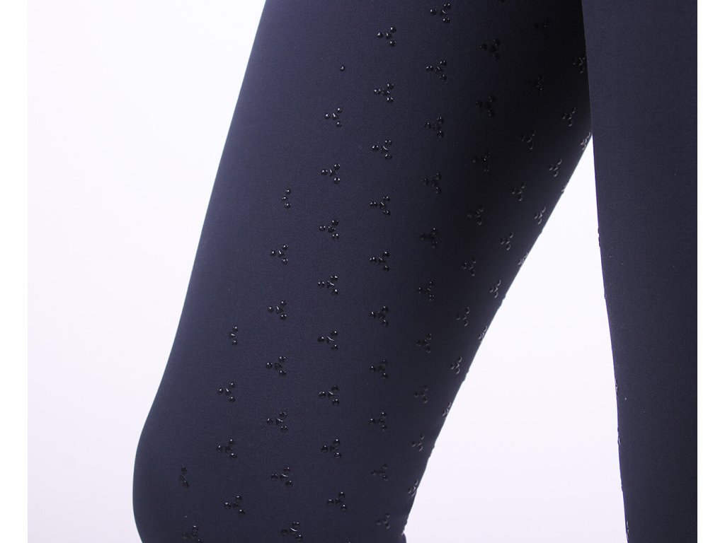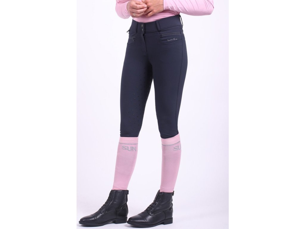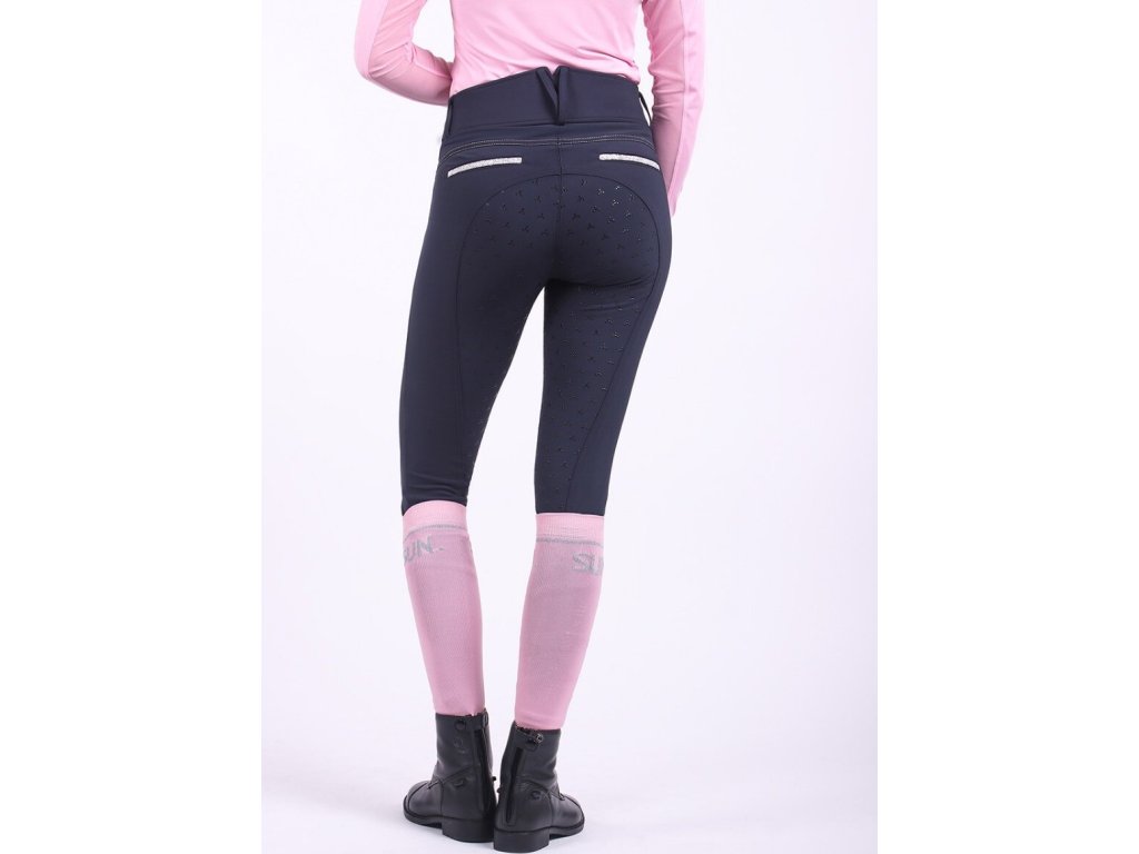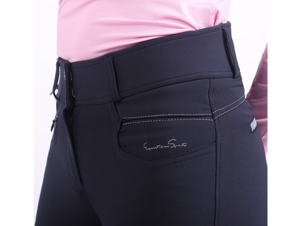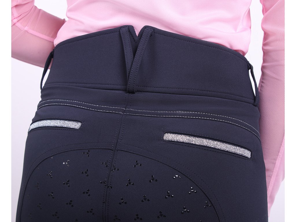 Bryczesy damskie wykonane z elastycznego materiału, który jest miękki i bardzo wygodny. Bryczesy posiadają silikonowy antypoślizgowy lej, wysoki stan i lycrę na nogawkach. Wyposażone są w kieszenie na zamek oraz dwie imitacje kieszeni z tyłu. Ozdobione są srebrnymi przeszyciami, co nadaje bryczesom elegancki wygląd. Dostępne również w kolorze jasnoniebieskim. Część letniej kolekcji 2022.