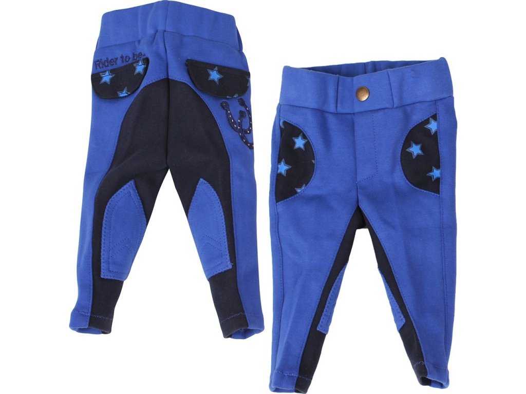 Urocze bryczesy dla najmłodszych jeźdźców. Posiadają ciemnoniebieskie siedzisko z materiału i wzmocnienia na kolanach. Ozdobione gwiazdkowym haftem na kieszeniach. Dostępne również w kolorze różowym.