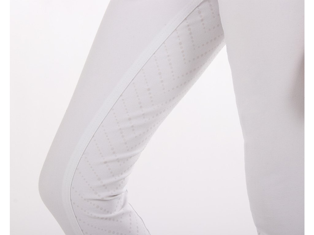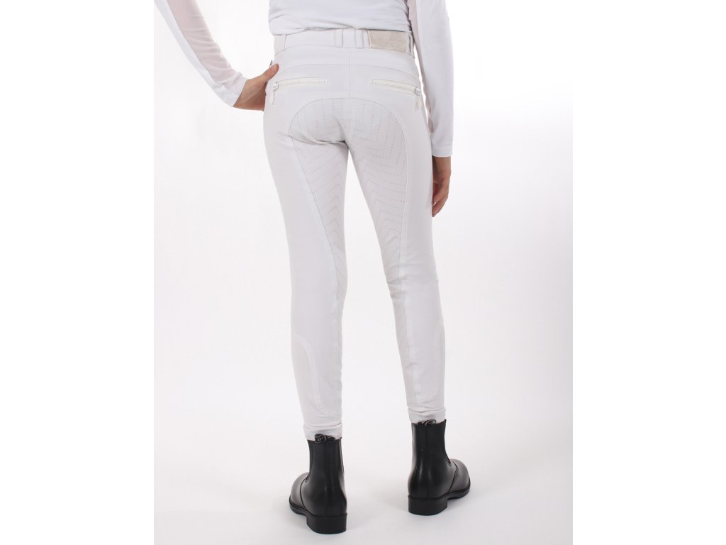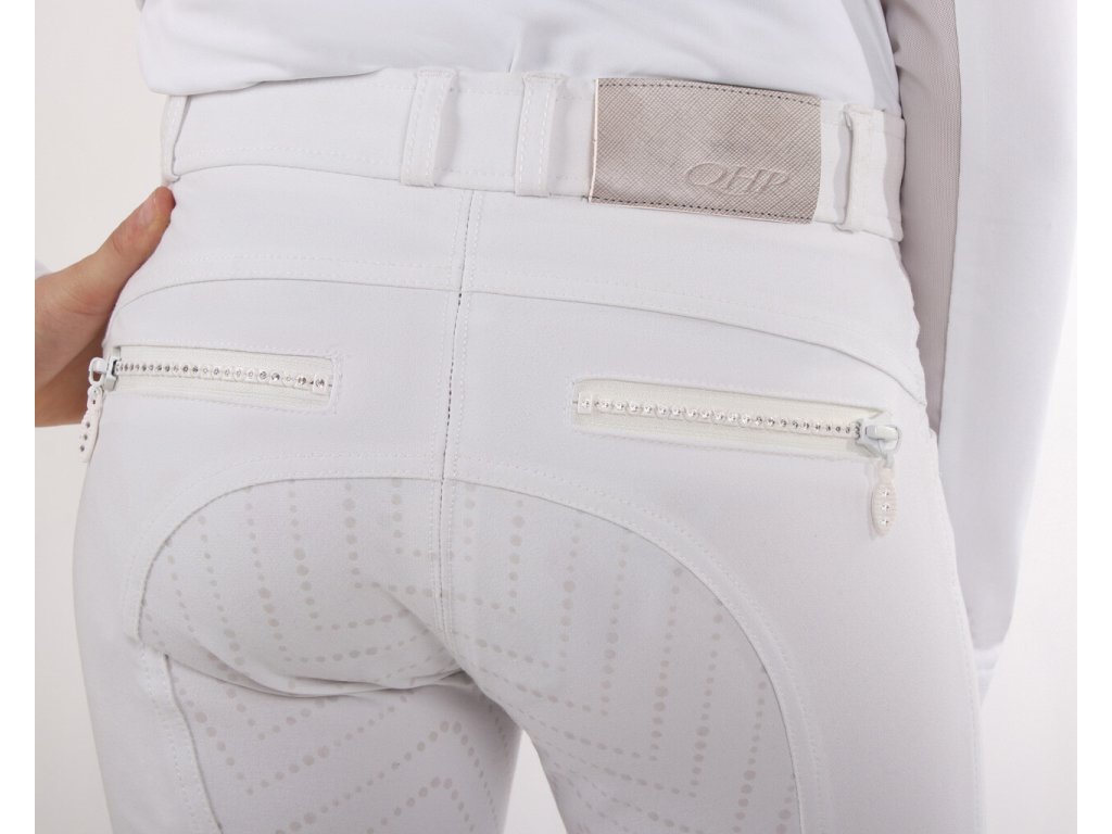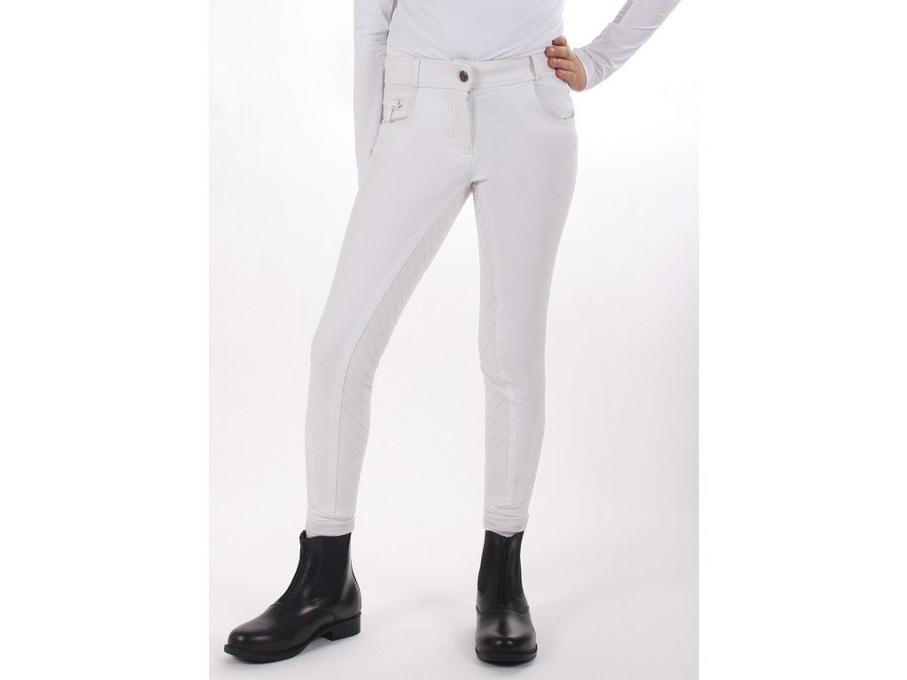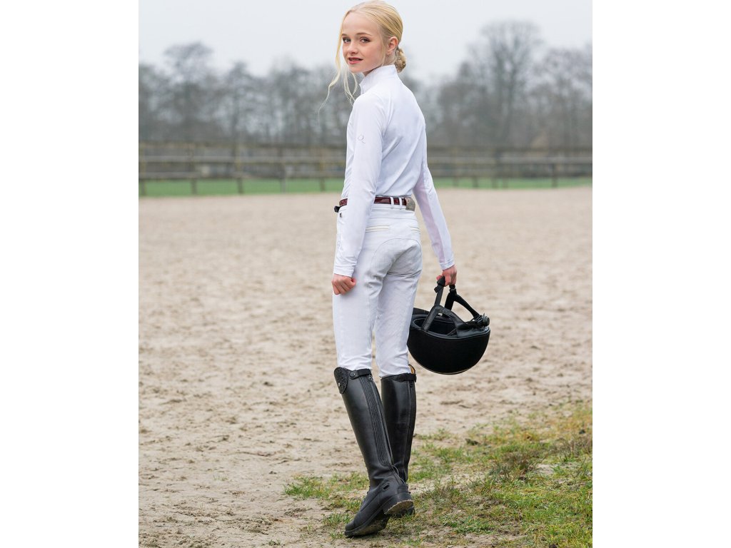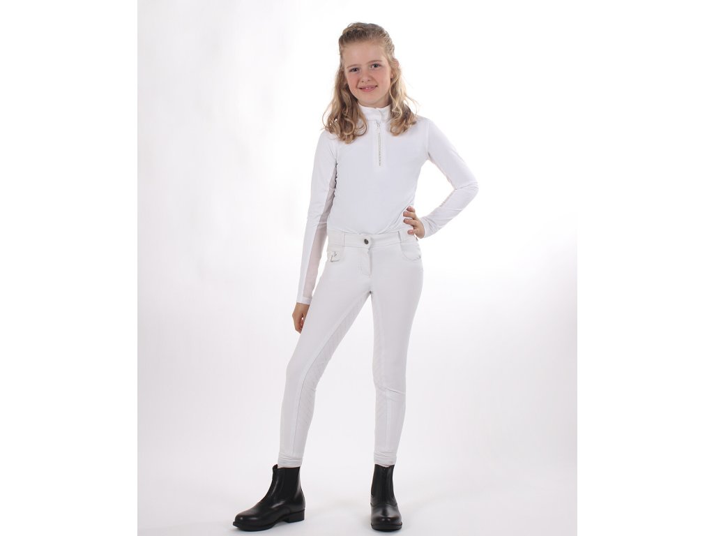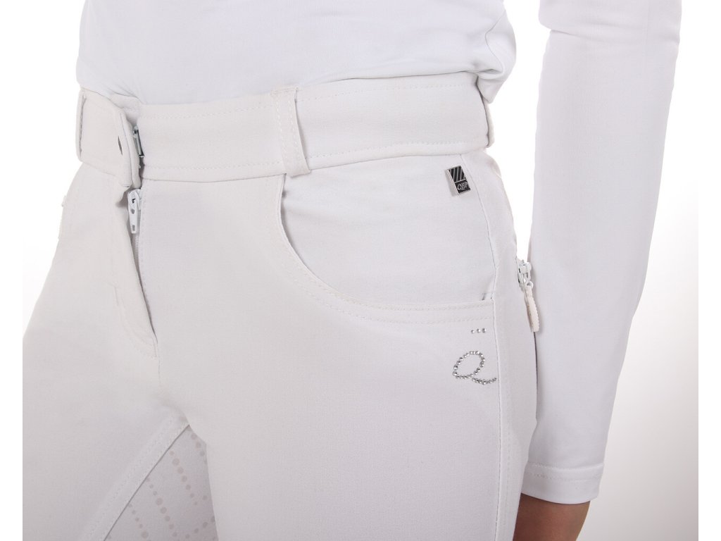 Bardzo wysokiej jakości bryczesy dziecięce z wyższym stanem i antypoślizgowym silikonowym lejem, który idealnie przylega do siodła. Wykonane są z oddychającego i elastycznego materiału, który doskonale odprowadza wilgoć i odpycha wodę. Wyposażone są w szlufki na pasek i lycrę na nogawkach. Ozdobione są imitacją kieszeni i zamkami błyskawicznymi z błyszczących cyrkonii, które nadają bryczesom elegancki wygląd. Bryczesy nadają się do noszenia przez cały rok i są dostępne w wielu wariantach kolorystycznych oraz rozmiarach damskich.