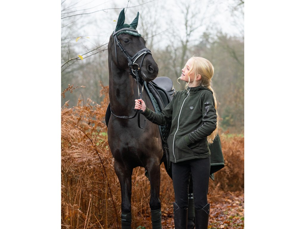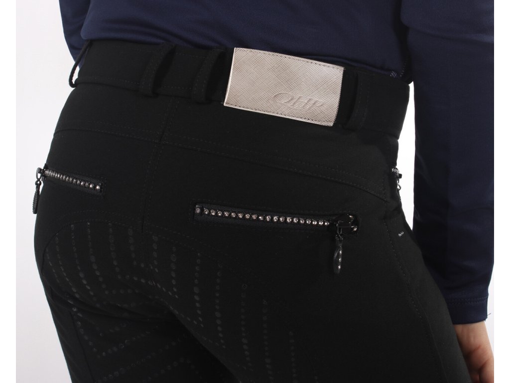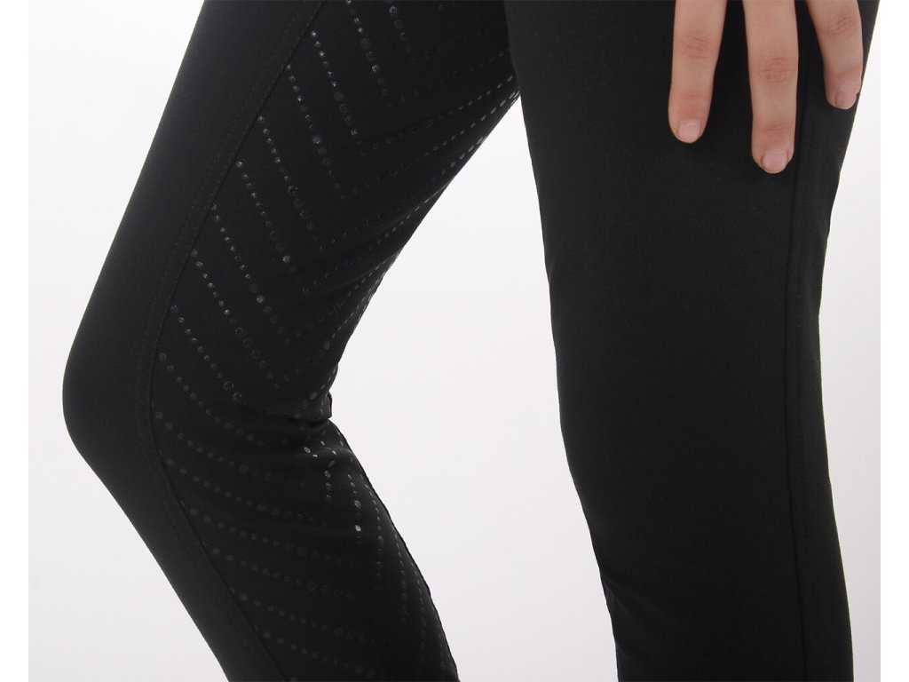 Bardzo wysokiej jakości bryczesy dziecięce z wyższym stanem i antypoślizgowym silikonowym lejem, który idealnie przylega do siodła. Wykonane są z oddychającego i elastycznego materiału, który doskonale odprowadza wilgoć i jest wodoodporny. Wyposażone w szlufki na pasek, dwie kieszenie z przodu i lycrę na nogawkach. Ozdobione imitacją kieszeni z tyłu i zamkami błyskawicznymi ozdobionymi błyszczącymi cyrkoniami, dodając eleganckiego akcentu bryczesom. Bryczesy nadają się do noszenia przez cały rok i są dostępne w wielu wariantach kolorystycznych oraz rozmiarach damskich.