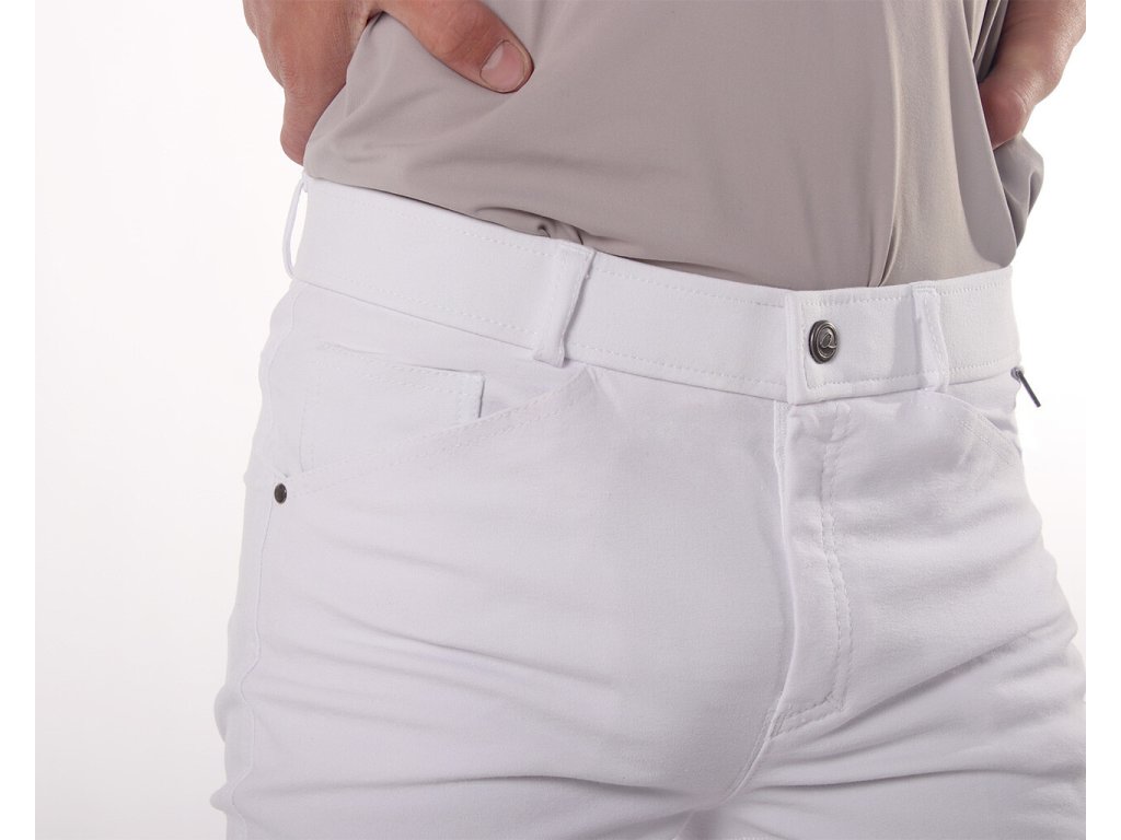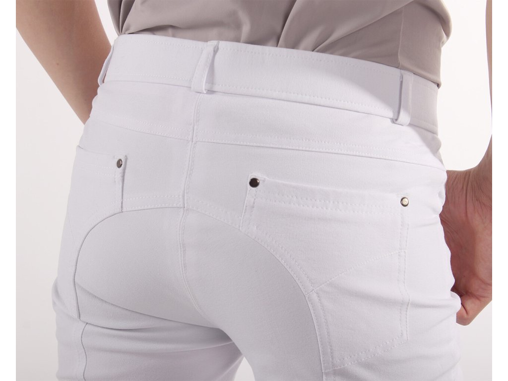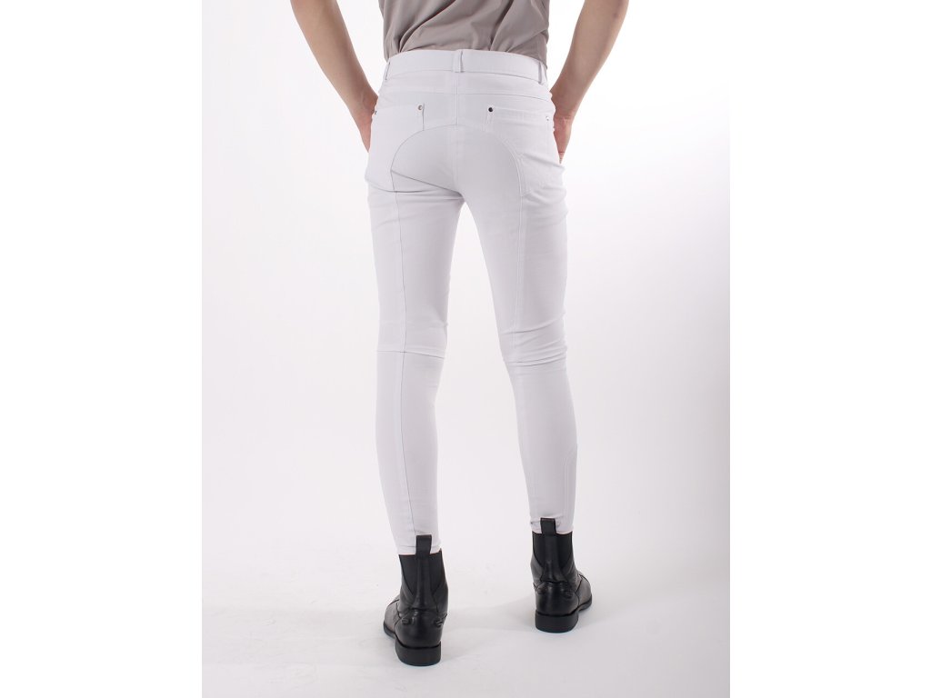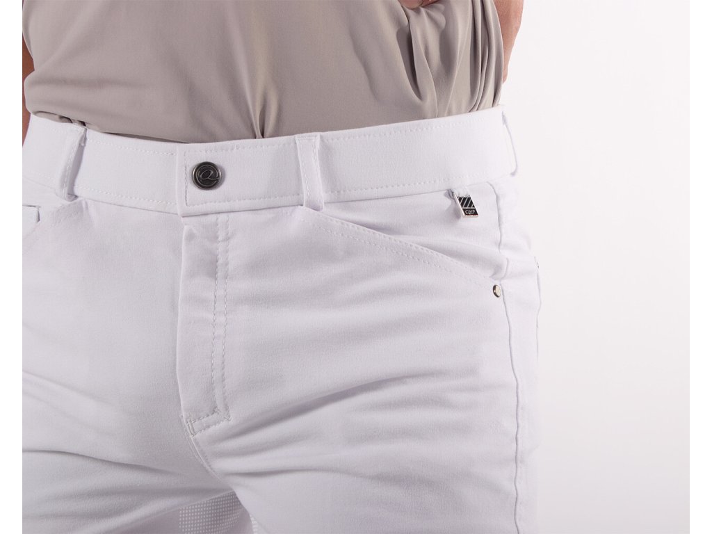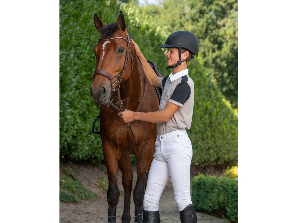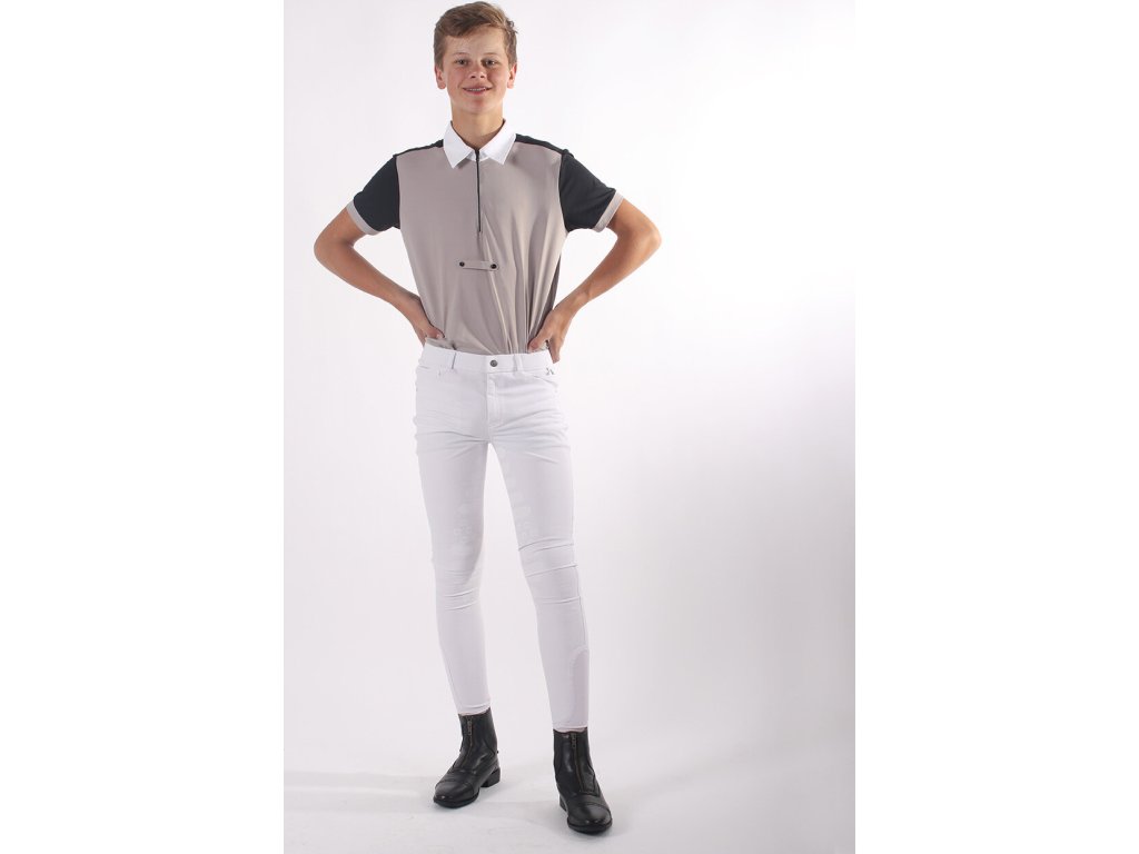 Bryczesy chłopięce na zawody z silikonowym antypoślizgowym lejem. Wykonane z miękkiego i bardzo wygodnego materiału. Wyposażone w dwie kieszenie z tyłu i z przodu, małą kieszonkę na monety i lycrę na nogawkach. Ozdobione małym metalowym emblematem QHP po lewej stronie. Dostępne również w kolorze czarnym.