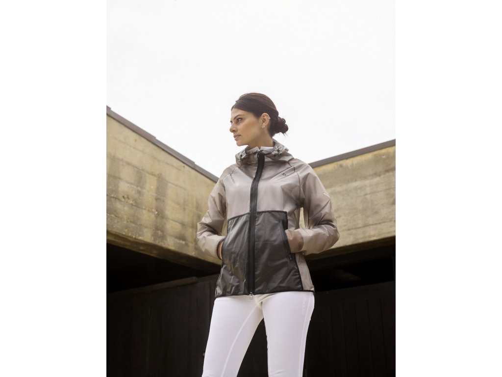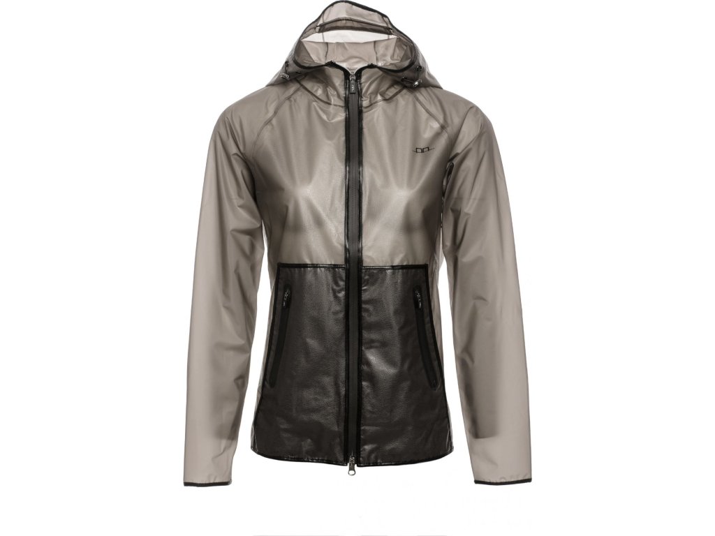 Półprzezroczysta kurtka wodoodporna z bocznym systemem wentylacji. Kurtka posiada klejone szwy, zapinane na zamek kieszenie oraz dwukierunkowy zamek błyskawiczny na całej długości. Kaptur można schować.
