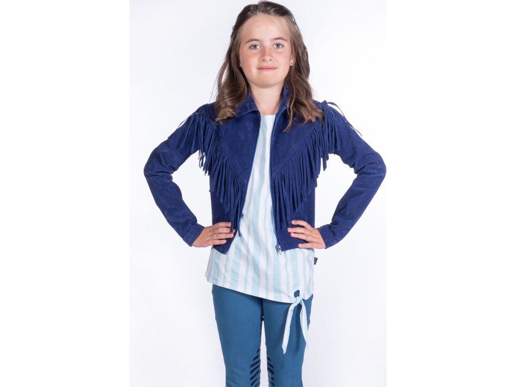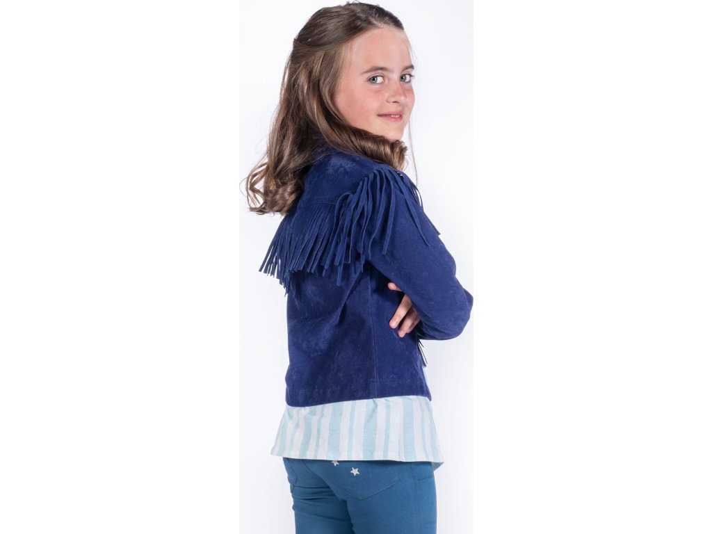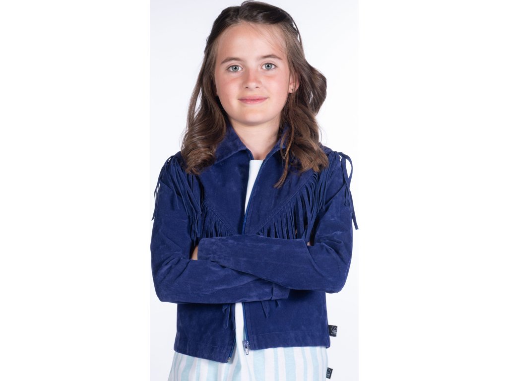 Dziecięca kurtka zamszowa z frędzlami, wykonana z poliestru. Wyposażona w zapięcie na zamek błyskawiczny. Można prać w pralce w delikatnym cyklu i suszyć w suszarce bębnowej. Dostępna w kolorze granatowym oraz w rozmiarach dziecięcych.