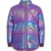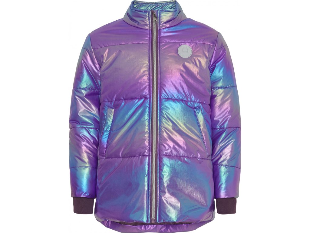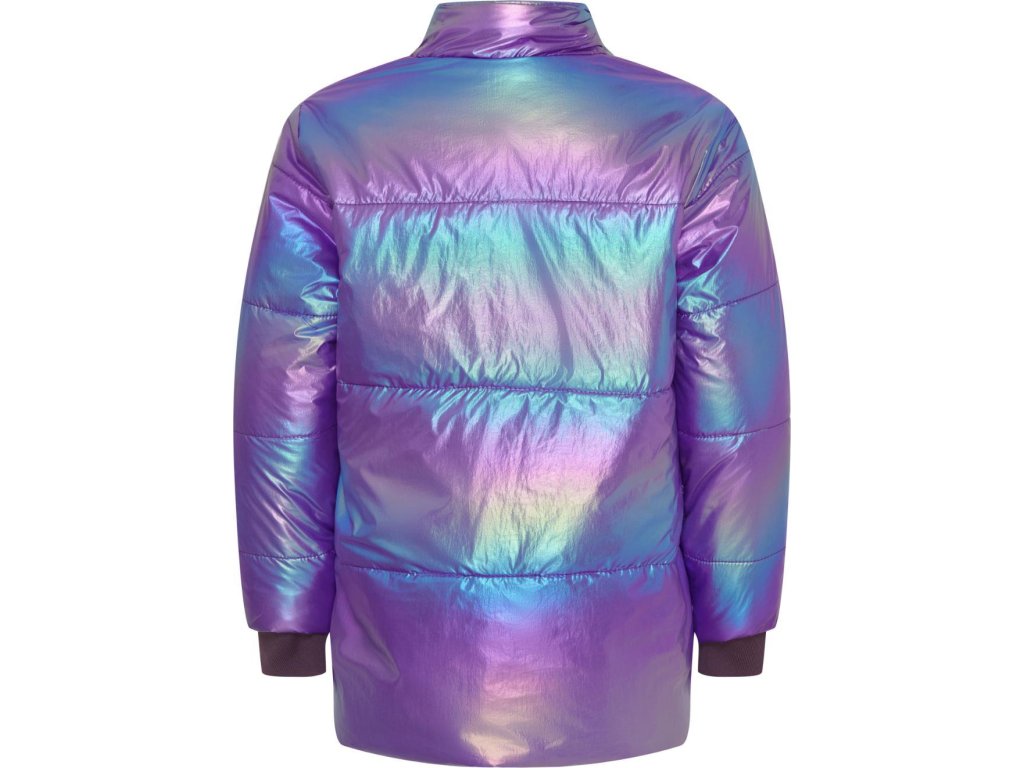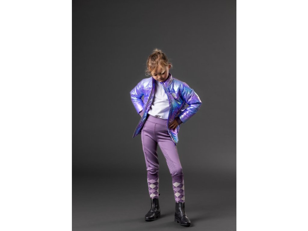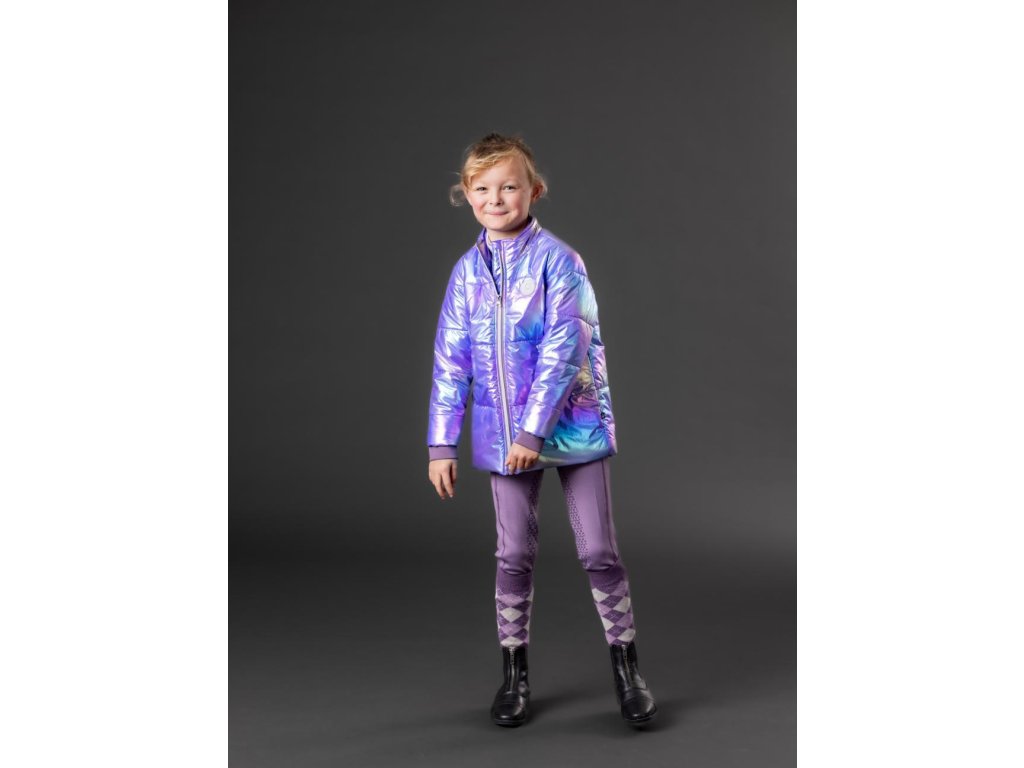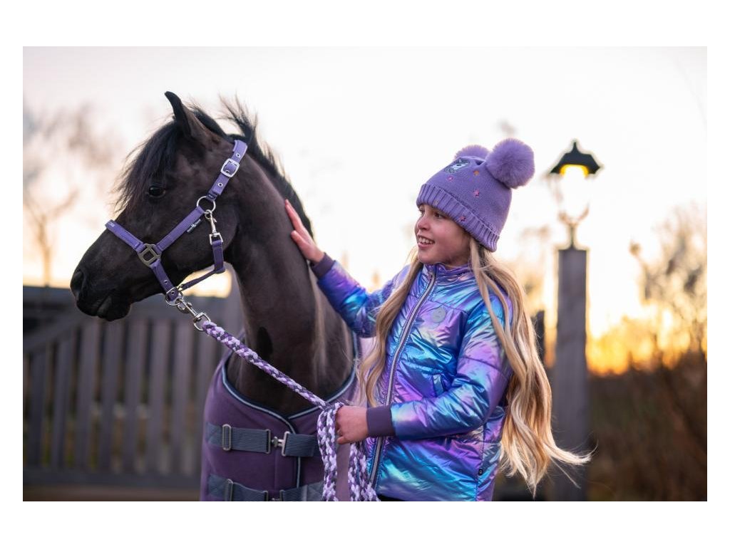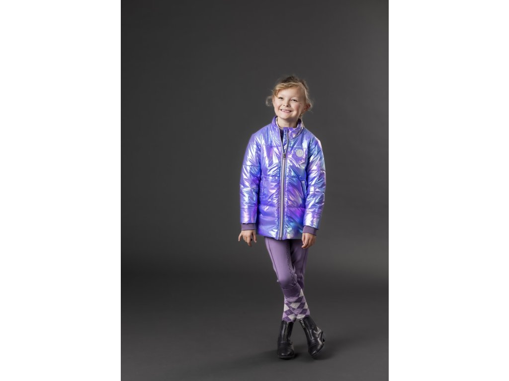 Pikowana kurtka puchowa w kolorze fioletowym z tęczowymi odcieniami od Equipage. Materiał zewnętrzny posiada właściwości wiatroszczelne i wodoodporne. Kurtka jest wyposażona w kieszenie z przodu. Zamek błyskawiczny z przodu ma matowy srebrny kolor, a kurtka jest również ozdobiona odblaskowym logo marki na piersi. Nadają się do noszenia w stajni i na co dzień. Ozdobiona odblaskowym logo na piersi.