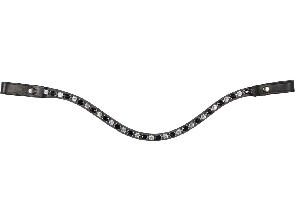 Naczółek wykonany z wysokiej jakości skóry. Wyposażony w zapięcie na guziki, dzięki czemu można go łatwo zdjąć i założyć na uzdę. Ozdobiony błyszczącymi cyrkoniami. W kształcie litery U. Dostępny w wielu opcjach kolorystycznych.