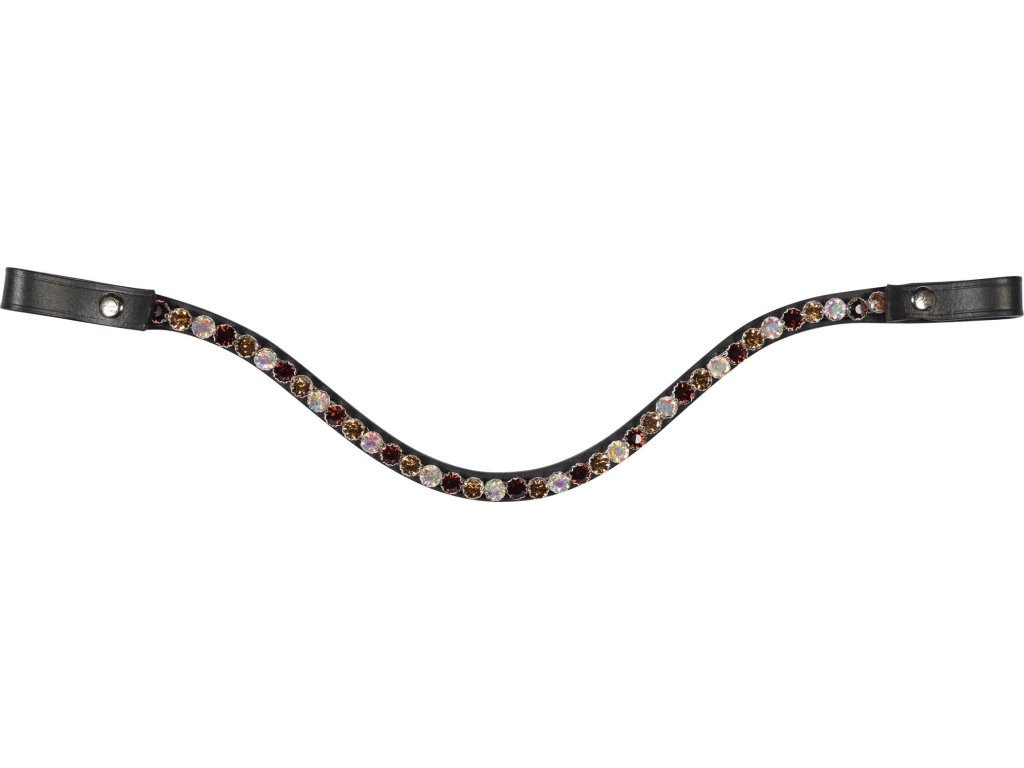 Naczółek wykonany z wysokiej jakości skóry. Wyposażony w zapięcie na guziki, dzięki czemu można go łatwo zdjąć i założyć na uzdę. Ozdobiony błyszczącymi cyrkoniami. Ma kształt litery u.