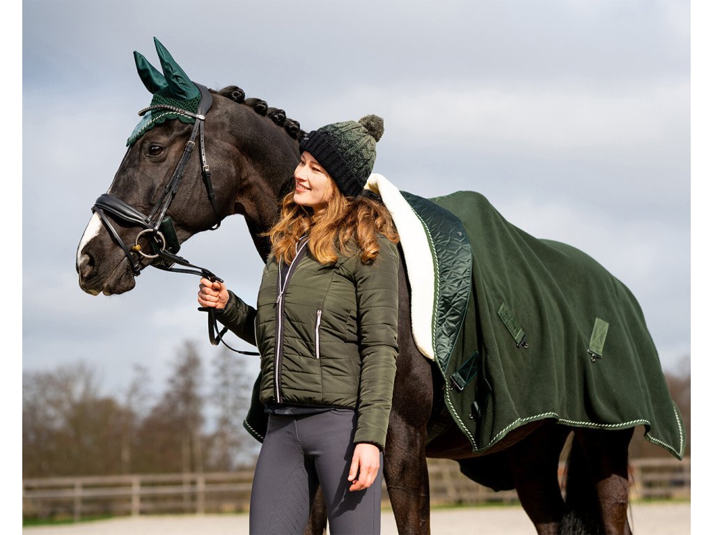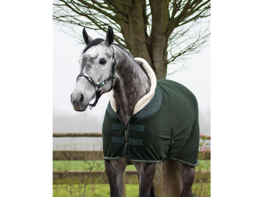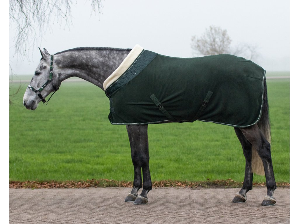 Wysokiej jakości derka chłodząca wykonana z miękkiego polaru dla maksymalnego komfortu. Derka jest wyposażona w podwójne zapięcie na klatce piersiowej, odpinane zapięcie krzyżowe pod brzuchem i sznurek ogonowy. Wyposażona jest w kołnierz wykonany z imitacji wełny, który zapobiega otarciom w okolicy kłębu. Jest ozdobiona dekoracyjną lamówką i satyną, co nadaje derce elegancki wygląd. Wszystkie okucia wykonane są z wysokiej jakości czarnej stali nierdzewnej. Derka idealnie pasuje do innych produktów z kolekcji Brilliance i jest dostępna w kilku wersjach kolorystycznych.