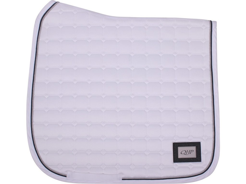 Elegancki czaprak o atrakcyjnym, błyszczącym wyglądzie z kwadratowymi przeszyciami. Ozdobiony podwójnym obszyciem i brokatowanym haftem z metalicznym logo QHP. Jego podszewka pochłania pot i jest bardzo praktyczna. Idealnie pasuje do butów jeździeckich Sasha i Romy oraz kasku jeździeckiego Glitz. Czaprak jest dostępny w kilku wersjach kolorystycznych. Chcesz wiedzieć, jakiego rozmiaru potrzebuje twój koń? Zobacz tabelę rozmiarów.