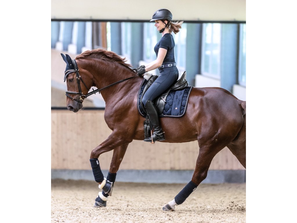 Wysokiej jakości czaprak o anatomicznym kroju. Wyściółka o gramaturze 200 g/m² wraz z pianką o grubości 10 mm gwarantuje komfort i równomierne rozłożenie nacisku. Posiada miękkie wypełnienie na kłębie dla maksymalnego komfortu oraz małą kieszonkę odpowiednią na smakołyki. Piękne kwiatowe przeszycia wraz z ozdobnym sznurkiem w kolorze różowego złota nadają czaprakowi elegancki wygląd. Idealnie pasuje do innych produktów z serii Modern Rosé.