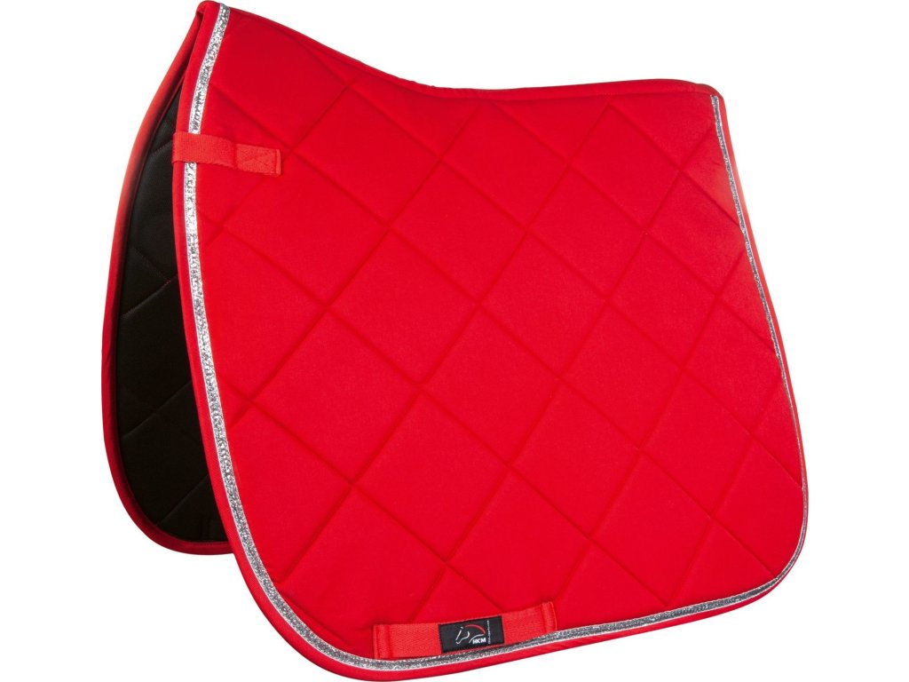 Wysokiej jakości czaprak HKM, o anatomicznym kształcie. Czaprak jest ozdobiony brokatem na całym obwodzie, wygląda bardzo elegancko. Wyposażony w paski na rzepy ułatwiające przymocowanie do siodła. Wypełnienie zapewnia wysoki komfort. Dostępny w wersji wszechstronnej i ujeżdżeniowej. Idealnie pasują do kolekcji Romy HKM.