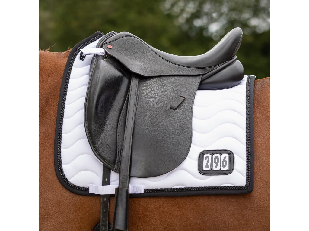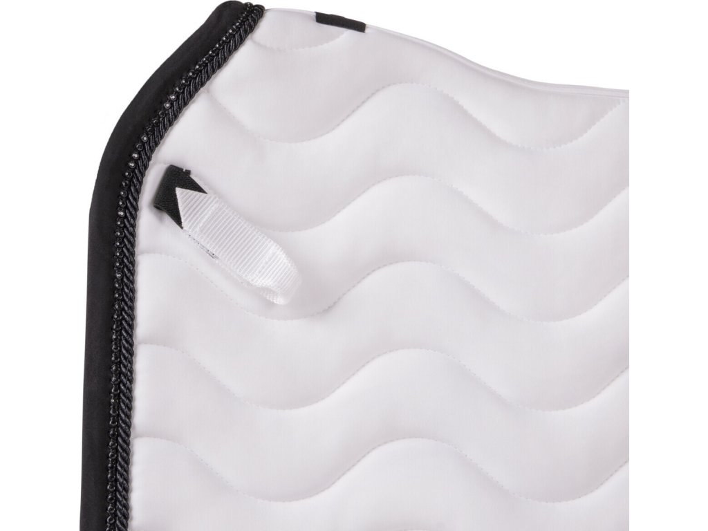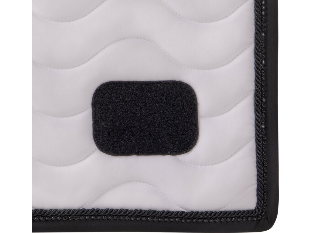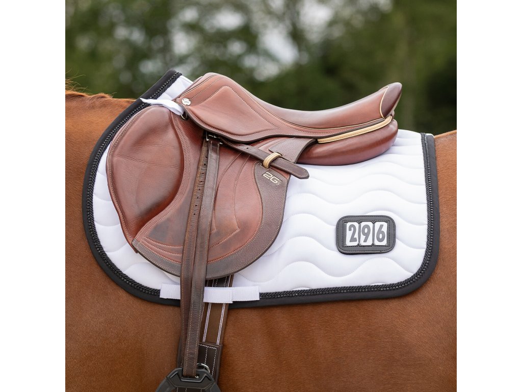 Elegancki czaprak z anatomicznie ukształtowaną częścią grzbietową. Wyposażony jest w numer startowy mocowany na rzep, po jednym z każdej strony. Wyposażony jest również w szlufki na popręg i krótkie paski do siodła z rzepem, które zapewniają bezpieczne utrzymanie czapraka na miejscu. Posiada wewnętrzną siateczkową podszewkę, która doskonale pochłania pot. Ozdobiony podwójną lamówką i cyrkoniami.