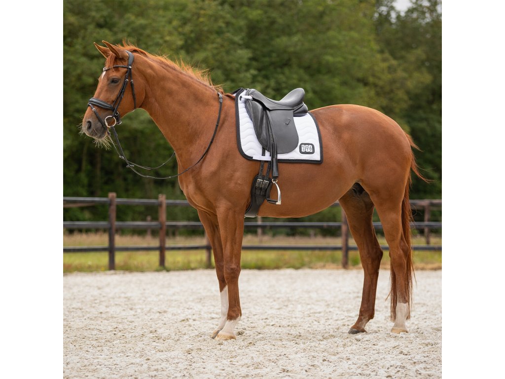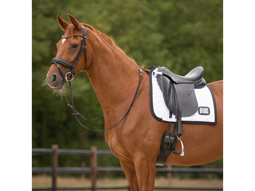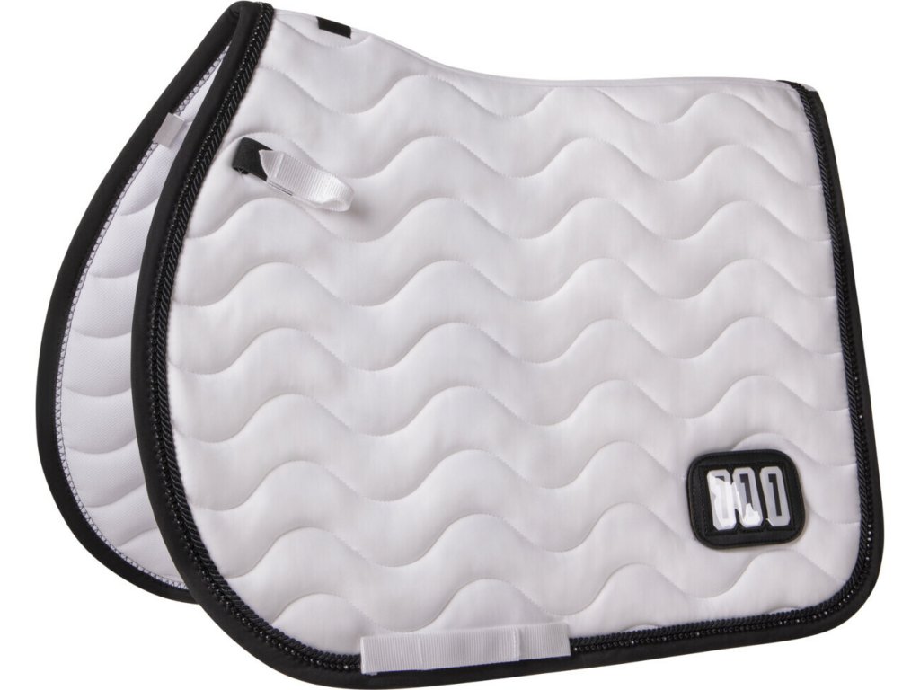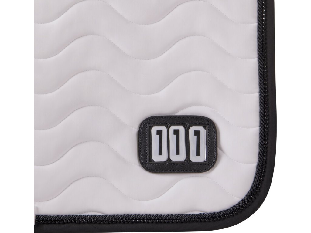 Elegancki czaprak z anatomicznie ukształtowaną częścią grzbietową. Wyposażony jest w numer startowy mocowany na rzep, po jednym z każdej strony. Wyposażony jest również w szlufki na popręg i krótkie paski do siodła z rzepem, które zapewniają bezpieczne utrzymanie czapraka na miejscu. Posiada wewnętrzną siateczkową podszewkę, która doskonale pochłania pot. Ozdobiony podwójną lamówką i cyrkoniami.