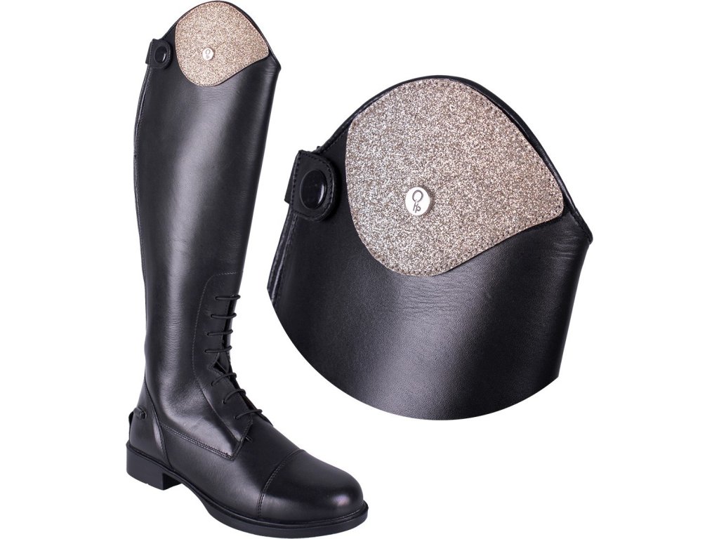 Wymienne części do wysokich butów jeździeckich Romy firmy QHP. Ozdobione brokatem, aby but lśnił stylowo. Można je zapiąć na rzep. Dostarczane w parach.