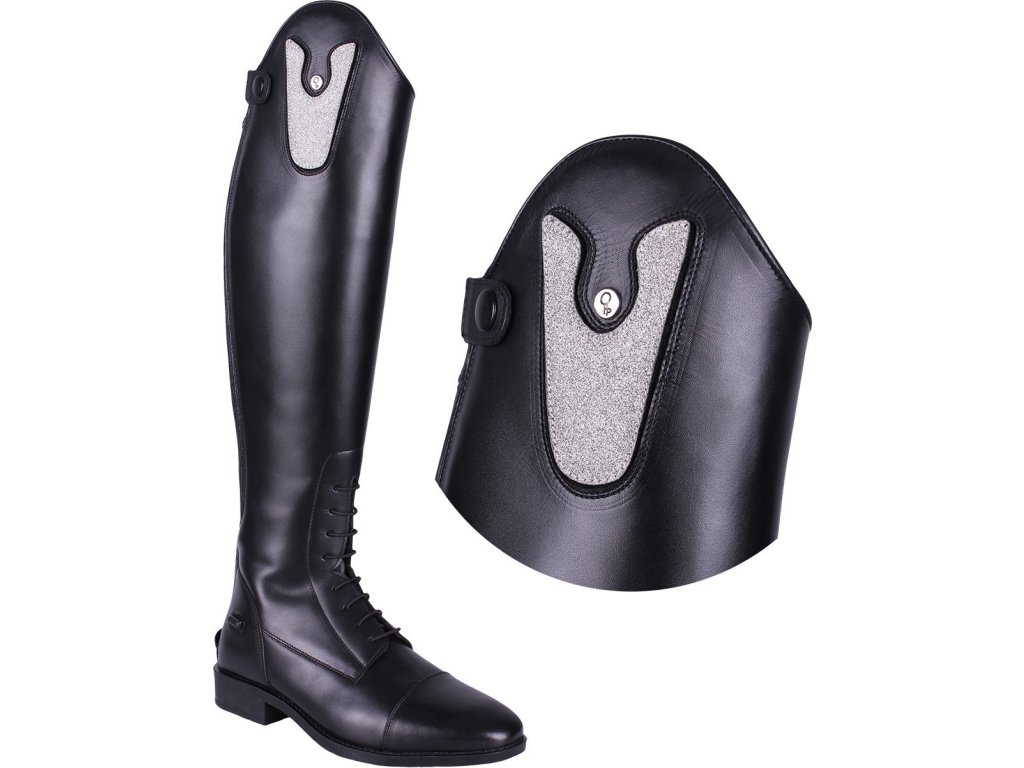 Wymienne części do wysokich butów jeździeckich Sasha firmy QHP. Ozdobione drobnymi, brokatowymi detalami. Można je zapiąć na rzep. Dostarczane w parach.