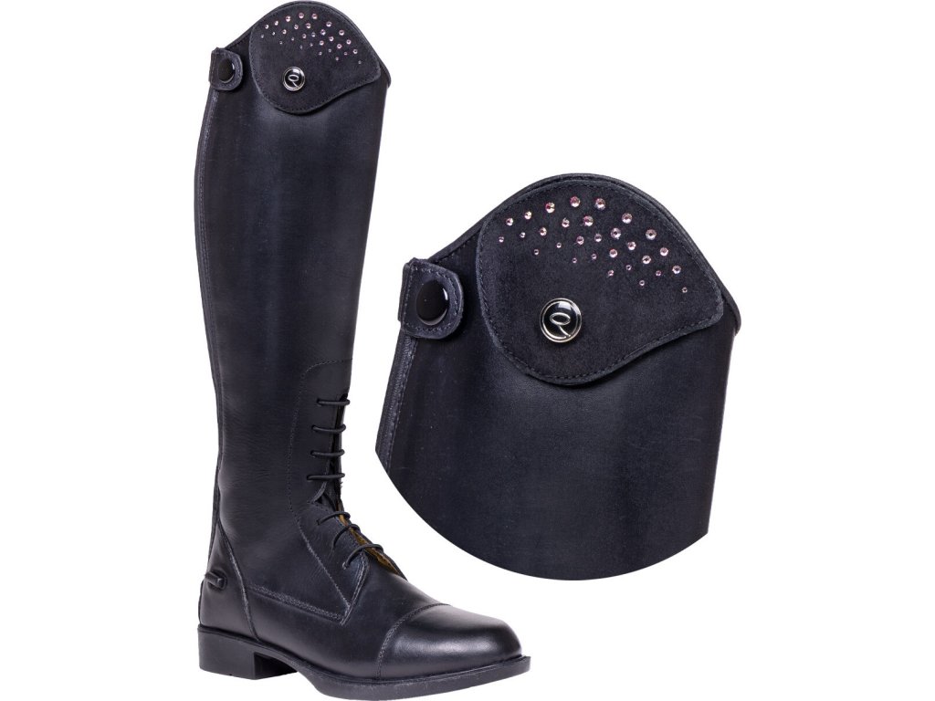 Wymienne części do wysokich butów jeździeckich Romy marki QHP. Zamszowy wygląd ozdobiony błyszczącymi cyrkoniami, które stylowo rozświetlają but. Można je zapiąć na rzep. Dostarczane w parach.