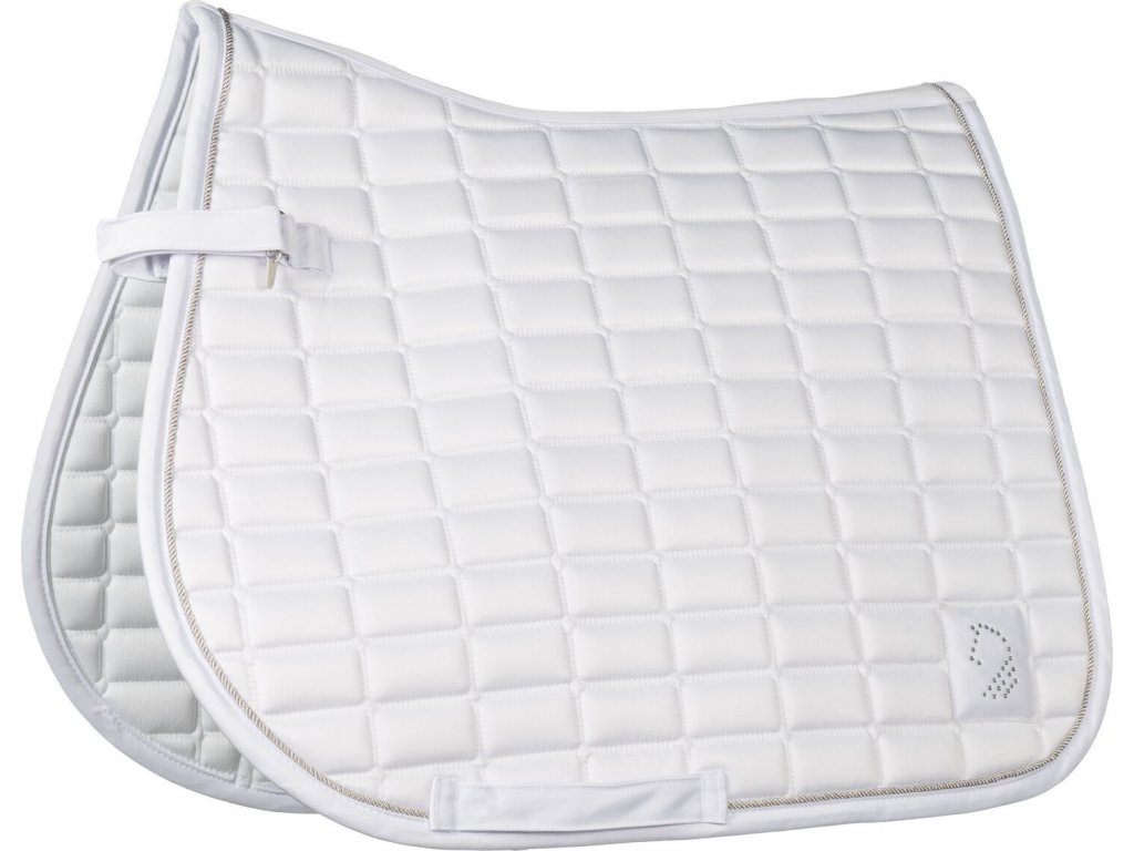 Czaprak wykonany z oddychającego materiału. Spodnia strona wykonana jest z siateczki. Dzięki silikonowemu nadrukowi jest antypoślizgowy. Wyposażony w odpinane paski do siodła i szlufki na popręg. Ozdobiony delikatnymi kryształkami. Można prać w pralce w temperaturze 30 stopni.
