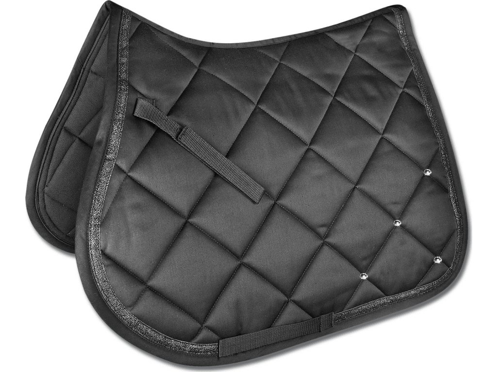 Wysokiej jakości czaprak z błyszczącą lamówką i dżetami, które nadają mu elegancki wygląd. Funkcjonalna strona spodnia zapewnia optymalną oddychalność. Optymalny rozkład nacisku jest zapewniony dzięki piance o grubości 8 mm i bawełnie o gramaturze 250 g / m².