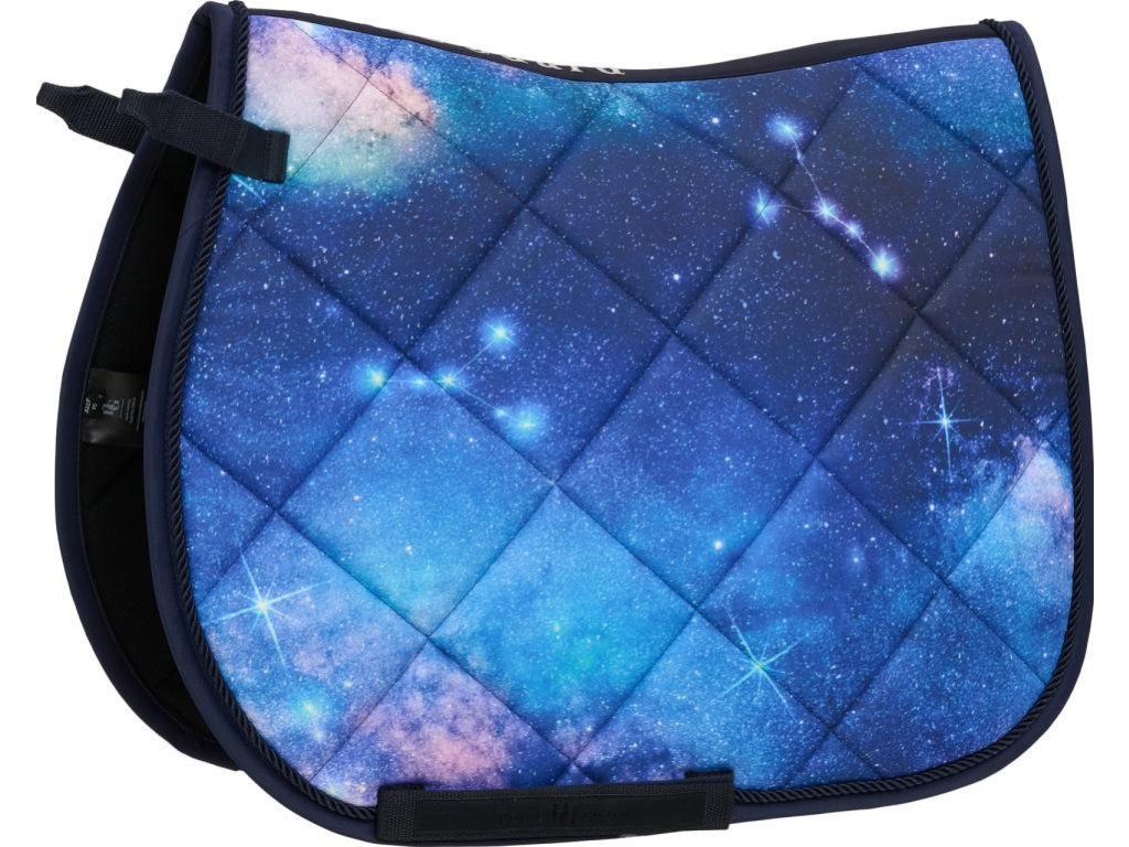 Stylowy czaprak z pełnym nadrukiem galaktyki i eleganckim pikowaniem. Krawędzie ozdobione są lamówką. Chłodząca podszewka z pianką 10 mm i wypełnieniem 200 g zapewnia komfort i funkcjonalność. Czaprak posiada pasek na popręg.