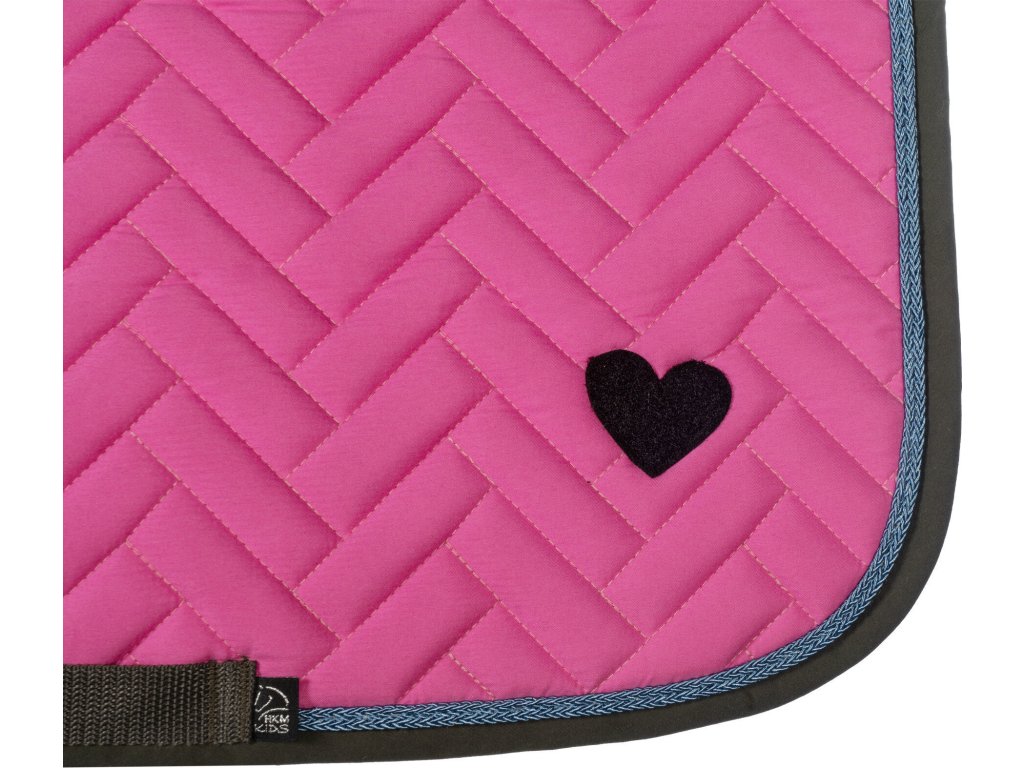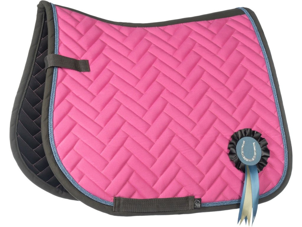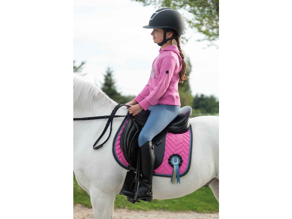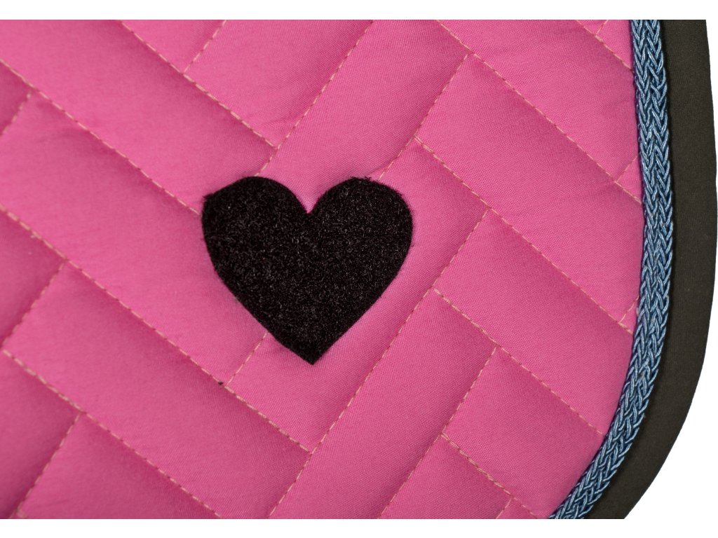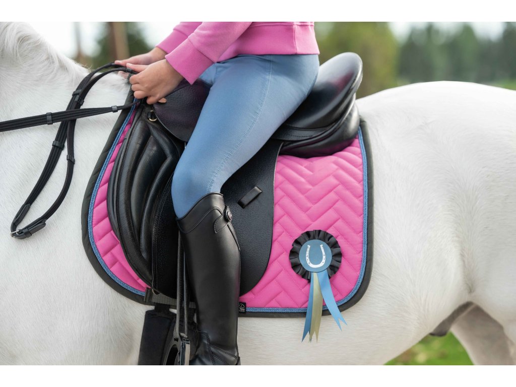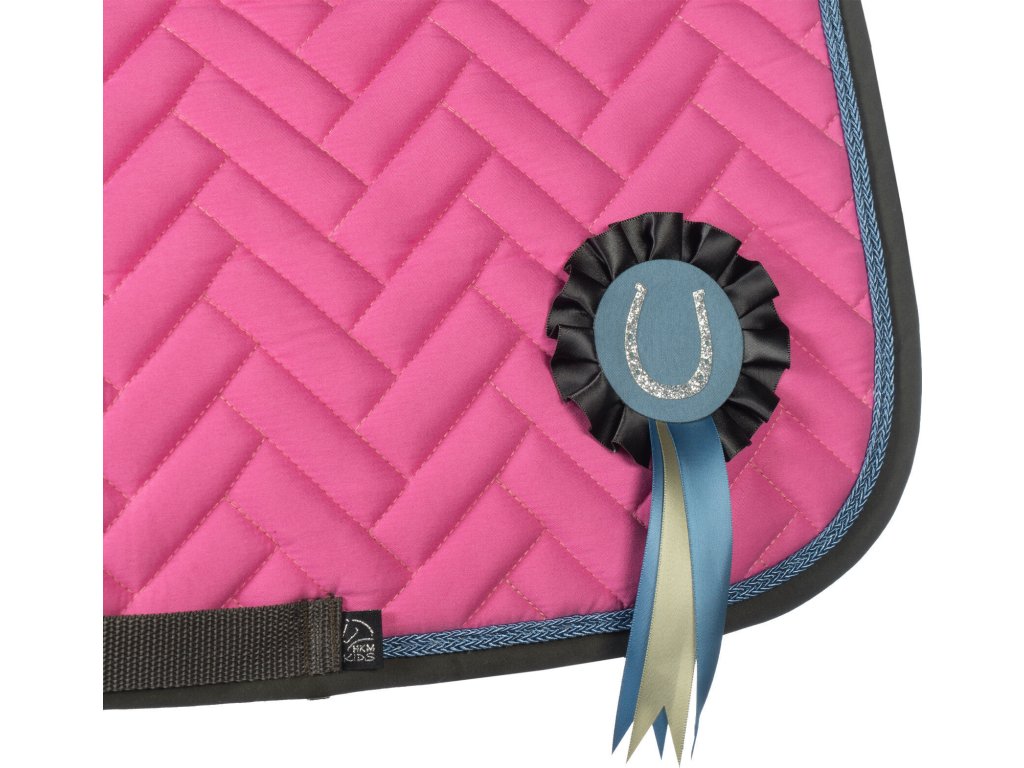 Uroczy czaprak dla kuców szetlandzkich.Ozdobiony lamówką i rozetą. Rozetę można zdjąć za pomocą rzepu. Po zdjęciu rozety czaprak jest ozdobiony zapięciem na rzep w kształcie serca. Czaprak posiada pętle na rzepy do mocowania siodła i klasyczne pętle do mocowania popręgu. Piankowe i bawełniane wypełnienie zapewnia równomierne rozłożenie nacisku.