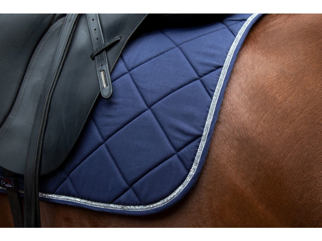 Wysokiej jakości czaprak HKM, o anatomicznym kształcie. Czaprak jest ozdobiony brokatem na całym obwodzie, wygląda bardzo elegancko. Wyposażony w paski na rzepy ułatwiające przymocowanie do siodła. Wypełnienie zapewnia wysoki komfort. Dostępny w wersji wszechstronnej i ujeżdżeniowej. Idealnie pasują do kolekcji Romy HKM.