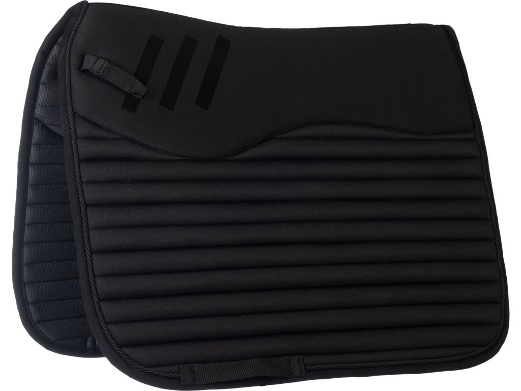 Czaprak z antypoślizgową powierzchnią dzięki silikonowemu nadrukowi. Anatomicznie ukształtowany dla idealnego dopasowania. Posiada wypełnienie z pianki i watoliny. Wyposażony w paski do mocowania siodła z zapięciem na rzep oraz paski do mocowania popręgu. Wykończony ozdobną lamówką.