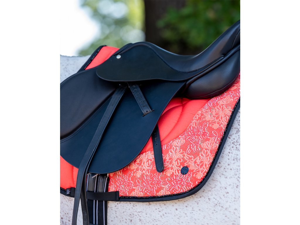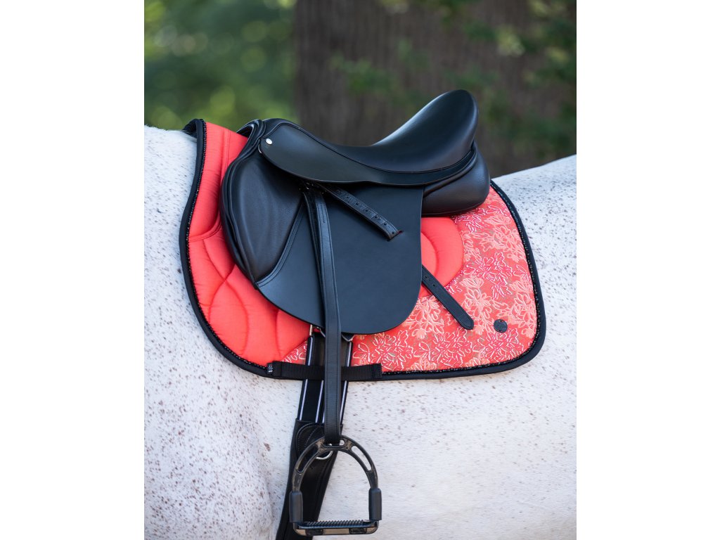 Wysokiej jakości czaprak o anatomicznym kształcie, idealnie dopasowany. Wyposażony w pętle na popręg. Ozdobiony czarnymi, syntetycznymi dżetami. Czaprak jest antypoślizgowy dzięki silikonowemu nadrukowi. Można prać w pralce w temperaturze 30°C. Dostępny również w kolorze beżowym. Idealnie pasują do innych produktów z kolekcji Savona Style.