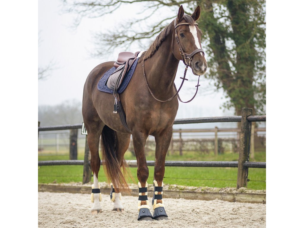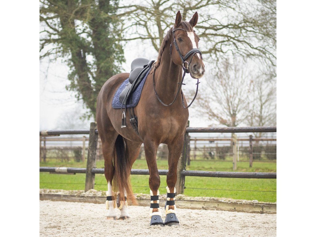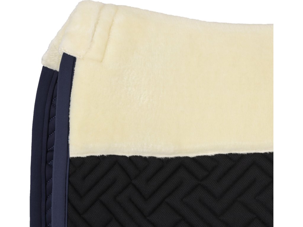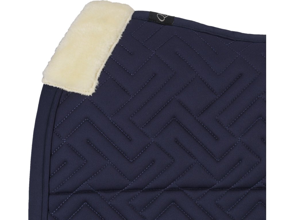 Elegancki, anatomicznie ukształtowany czaprak. Wyposażony jest w syntetyczne futro owcze w okolicy kłębu i na całej długości grzbietu, co zapewnia optymalny rozkład nacisku. Wewnętrzna siateczkowa podszewka jest oddychająca i skutecznie wchłania pot. Czaprak wyposażony jest w klasyczne pętle na popręg. Ozdobiony eleganckim pikowaniem, kontrastującą lamówką i subtelnym logo "Q".