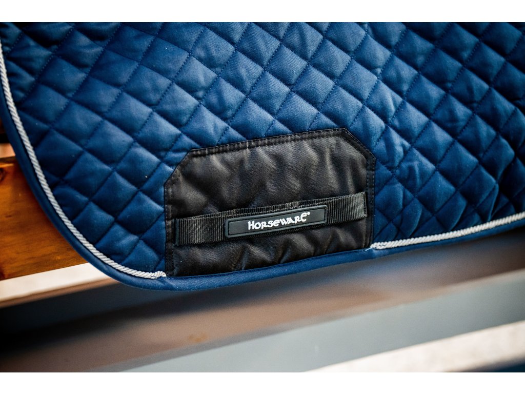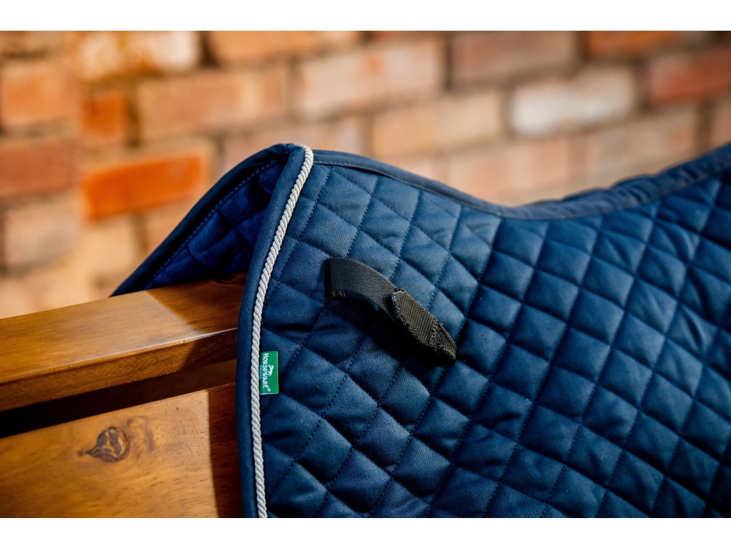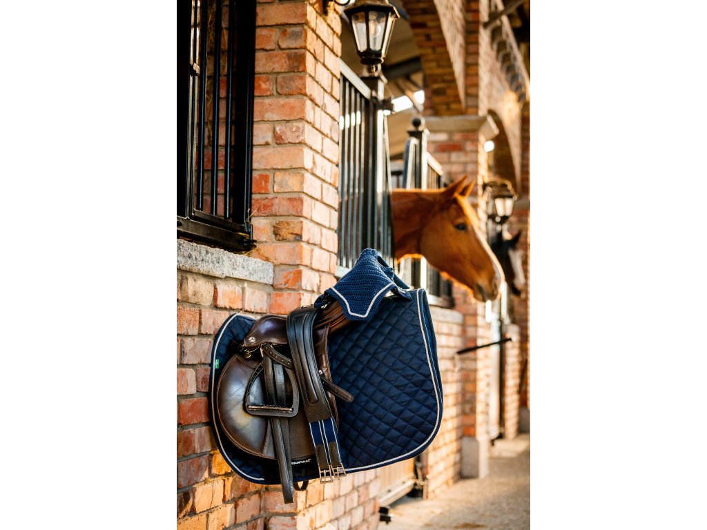 Czaprak skokowy z kolekcji Signature firmy Horseware! Wykonany z oddychającego materiału polibawełnianego (wytrzymałość 600 D), który zapewnia szybkie odprowadzanie wilgoci. Ukształtowany z podniesionym kłębem, dla maksymalnej swobody ruchu kręgosłupa pod siodłem. Podszewka wykonana z poliestrowego zamszu. Wyposażona w pętle na siodło i popręg. Można prać w pralce. Nauszniki można dokupić osobno.