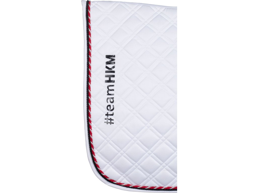 Wysokiej jakości czaprak HKM, o anatomicznym kształcie. Materiał zapewnia oddychalność. Czaprak jest obszyty podwójną lamówką. Jest ozdobiony logo na dole. Można prać w pralce w temperaturze 30° i suszyć w suszarce bębnowej.