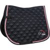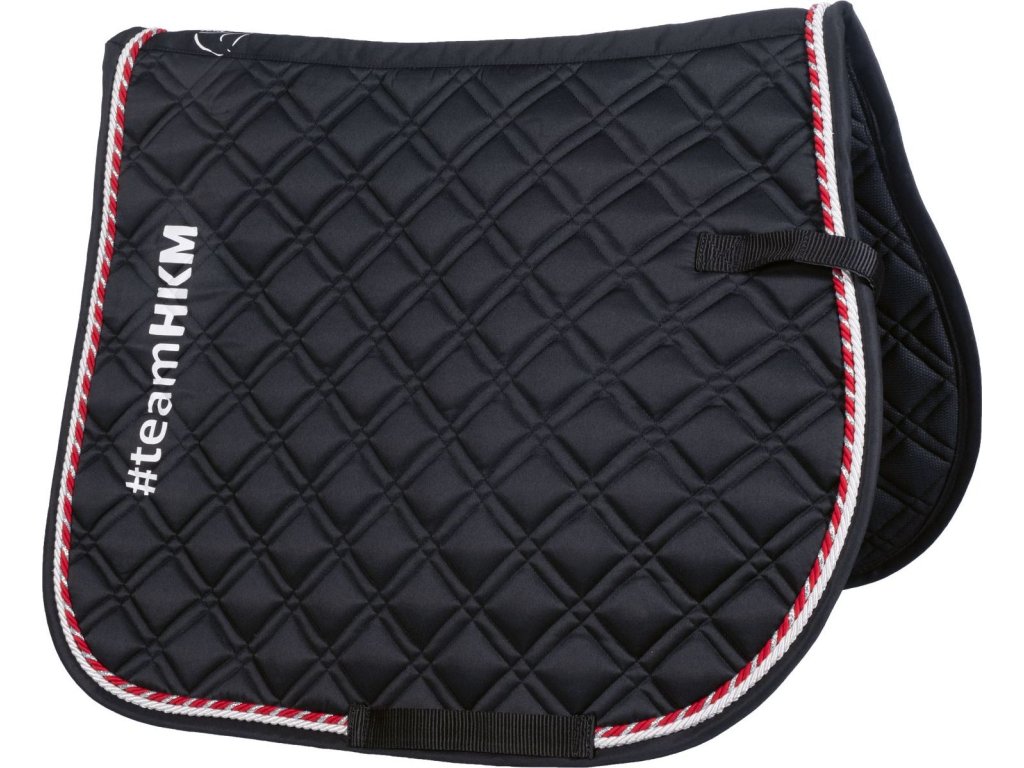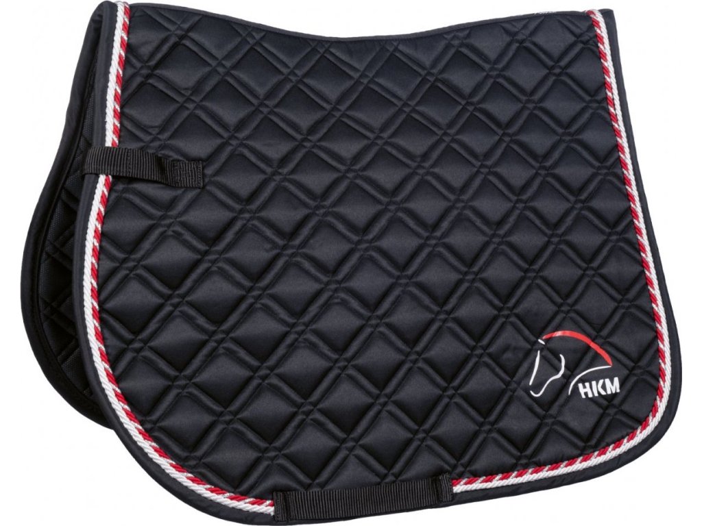 Wysokiej jakości czaprak HKM, o anatomicznym kształcie. Materiał zapewnia oddychalność. Czaprak jest wykończony podwójnym ozdobnym obszyciem. Jest ozdobiony logo na dole. Można prać w pralce w temperaturze 30° i suszyć w suszarce bębnowej.