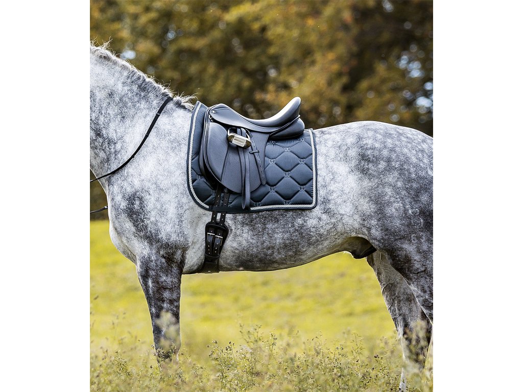 Wysokiej jakości i elegancki czaprak w jedwabnym stylu. Spodnia warstwa zapewnia maksymalną oddychalność. Pianka o grubości 10 mm wraz z wypełnieniem 200 g/m² zapewnia optymalny rozkład nacisku. Czaprak jest ozdobiony dekoracyjnym sznurkiem i małymi, pikowanymi znakami w kształcie litery W.