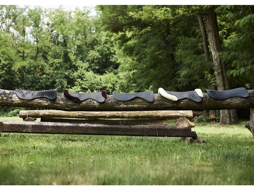 Unikalna i innowacyjna struktura tych amortyzujących podkładek składa się z licznych małych wypustek z bocznymi otworami, które umożliwiają intensywną, kontrolowaną poziomo cyrkulację powietrza. Oprócz tworzenia efektu panelu, który pochłania wstrząsy przy każdym ściśnięciu i zwolnieniu, wypustki tworzą przepływ odświeżającego powietrza, które utrzymuje grzbiet konia idealnie suchy. Funkcję tę wzmacniają duże, prostokątne wycięcia rozmieszczone na całej powierzchni podkładki.