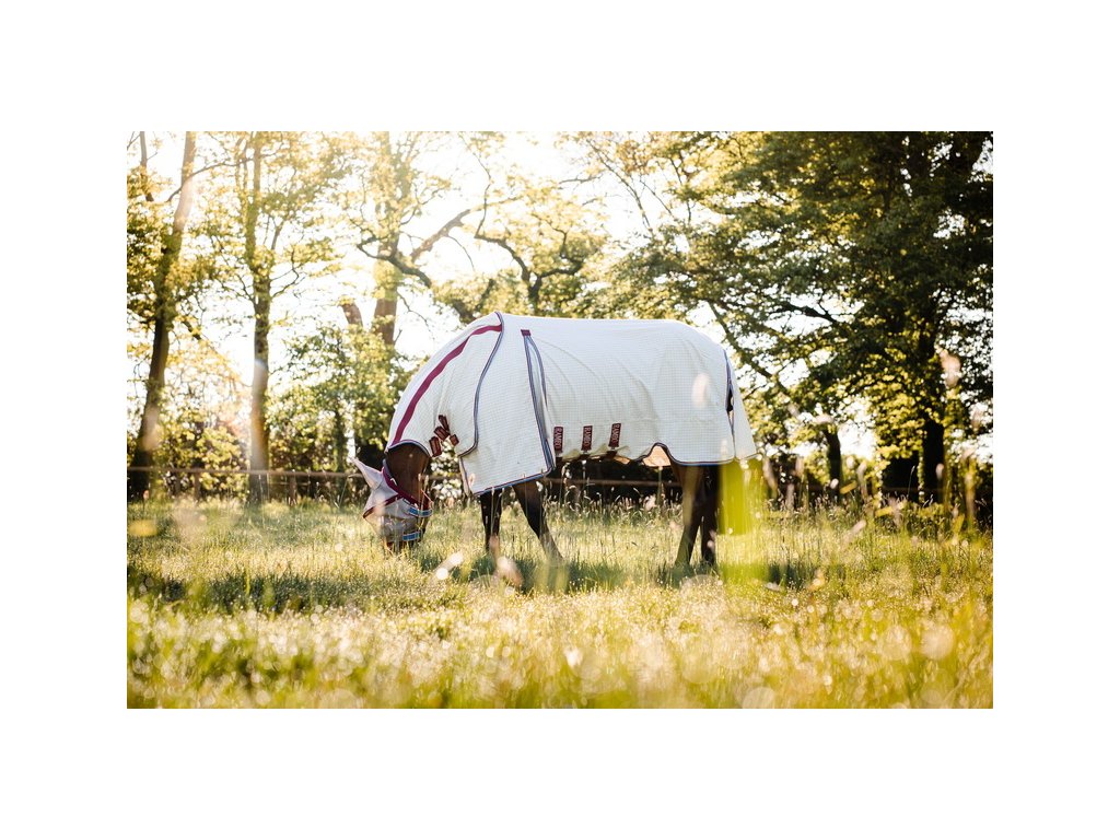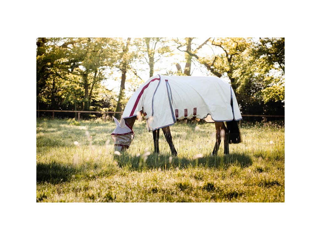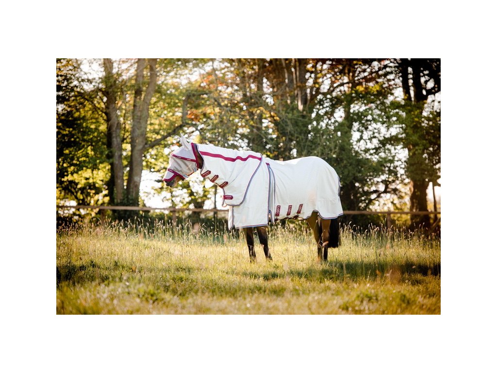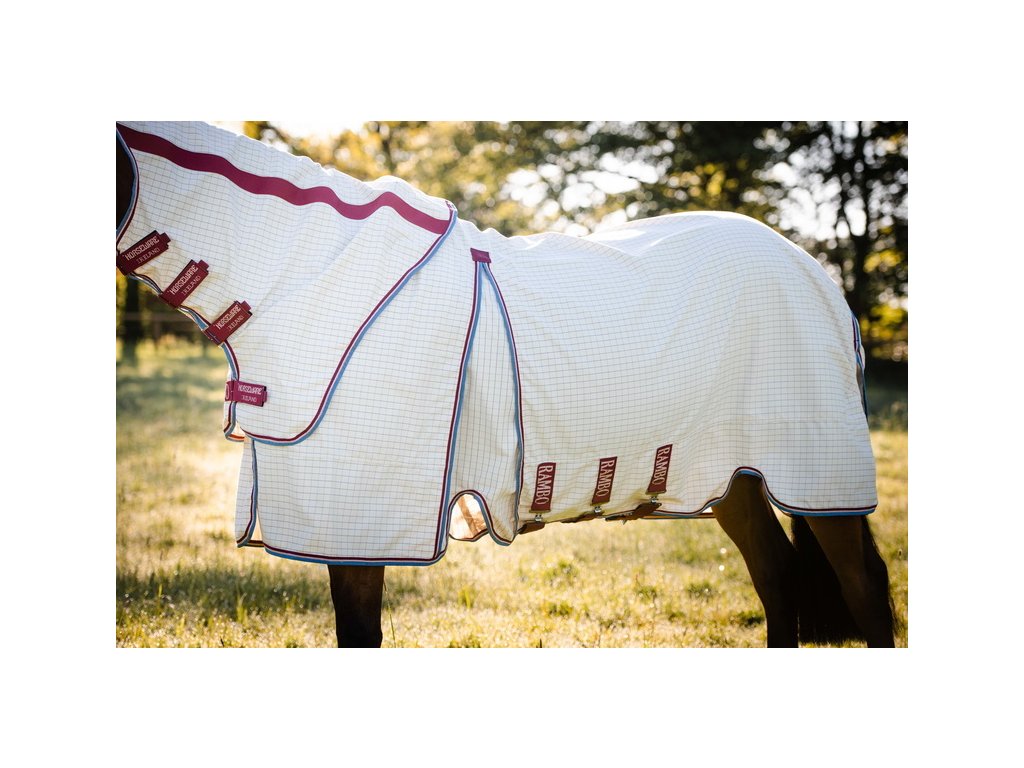 Wysokiej jakości letnia derka Rambo zapewniająca 90% ochronę przed promieniowaniem UV. Może również służyć jako skuteczna ochrona przed owadami. W zestawie z odpinanym kapturem na szyję. Technologia Split zapewnia szersze wycięcie w okolicy łopatek, pełen komfort i swobodę ruchów. Wykonana z materiału zewnętrznego z domieszką 40% bawełny. Materiał jest wyjątkowo oddychający i chroni przed przegrzaniem. Derka jest wyposażona w bardzo praktyczne i proste zapięcie na dysk z przodu. Posiada również potrójne zapięcie pod brzuchem, pasek pod ogon, ochraniacz ogona i anatomiczne wycięcie w okolicy nóg. Maska przeciw owadom i wewnętrzna wodoodporna podpinka (wyściółka) mogą być zakupione oddzielnie do derki.
