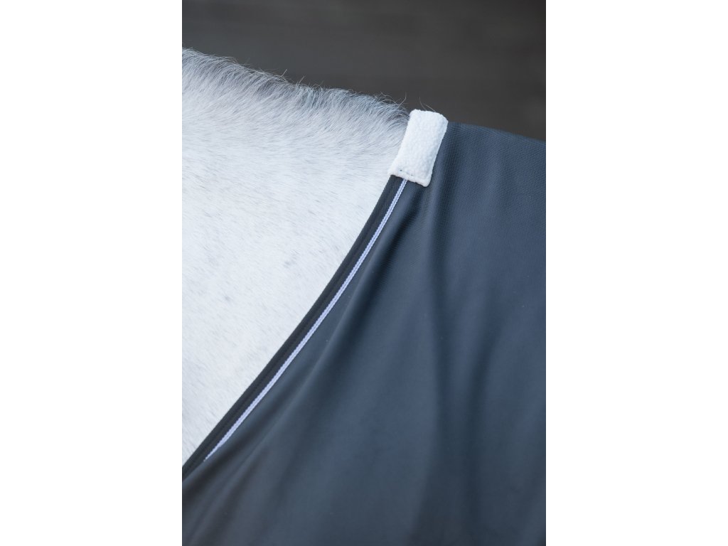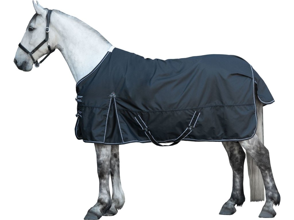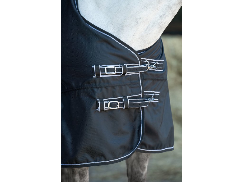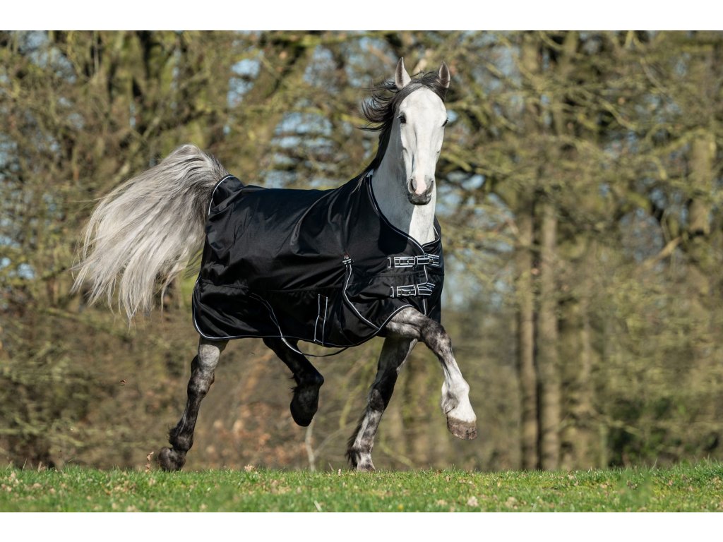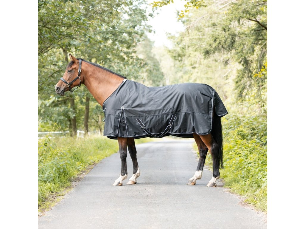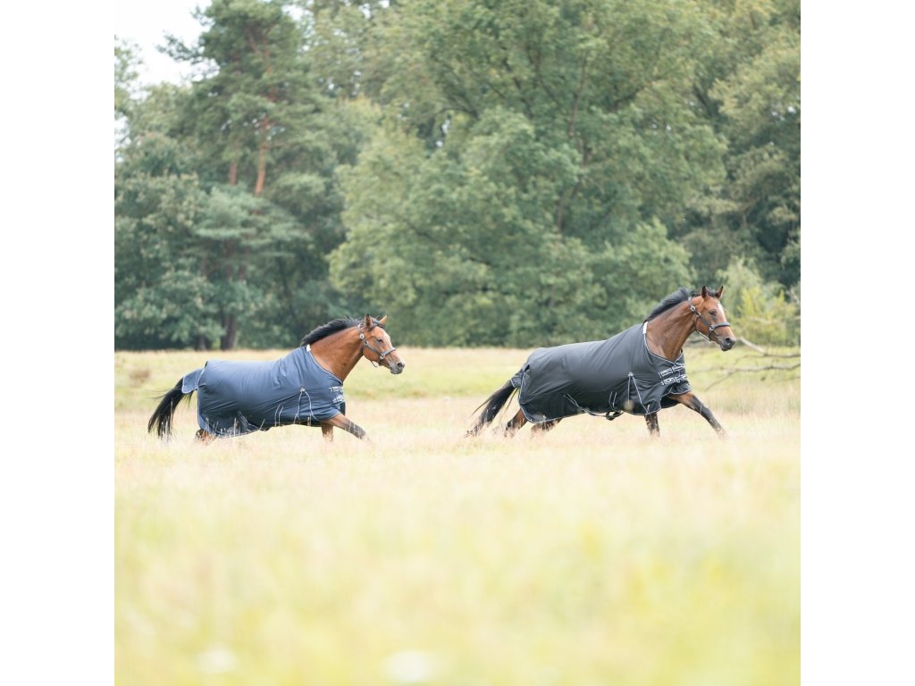 Wysokiej jakości derka padokowa bez ocieplenia, podszyta nylonem. Derka wykonana jest z bardzo mocnego, odpornego na rozdarcia materiału, który jest łatwy w czyszczeniu. Derka padokowa utrzymuje konia w cieple i suchości oraz chroni go przed nieprzyjemnym wiatrem. Wykonana z oddychającego, wiatroodpornego i wodoodpornego materiału 3000 mm/m² o wytrzymałości 1680 D. Wyposażona w podwójne zapięcie z przodu z klamrami na rzepy, zapięcie krzyżowe pod brzuchem i paski między tylnymi nogami. Wyposażona w sznurek pod ogon i ochraniacz na ogon. Elastyczny klin na łopatce gwarantuje maksymalną swobodę ruchów. Miękka wyściółka na kłębie zapobiega otarciom. OdblaskowaPaski po bokach i na ogonie zapewniają bezpieczeństwo. Dostępna w wielu rozmiarach.