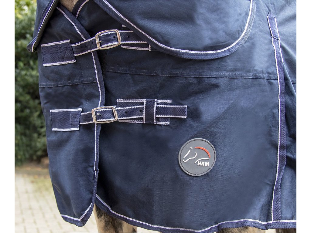 Bardzo wysokiej jakości wodoodporna derka od HKM. Derka wykonana jest z materiału odpornego na rozdarcia, nadaje się na deszczową lub wietrzną pogodę, materiał zapewnia wodoodporność, podszewka wykonana jest z bawełny. Kłąb jest wyściełany, aby zapobiec otarciom. Krój jest dopasowany do konia, właściwości derki zostały przetestowane w Niemczech. Przednie zapięcie jest podwójne, regulowane paski pod brzuchem z metalowymi sprzączkami. Derkę można prać w temperaturze 30° i suszyć w suszarce bębnowej.