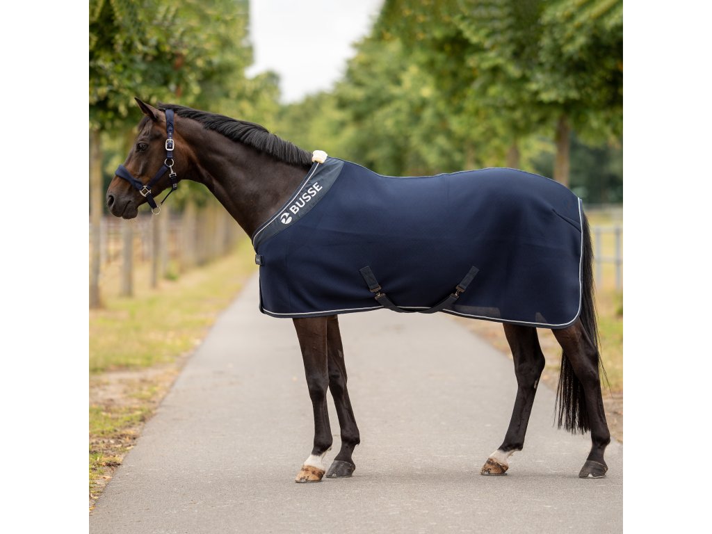 Wyjątkowa derka osuszająca, która zapewnia szczególnie szybkie i delikatne wchłanianie potu. Wykonana ze specjalnej tkaniny 3D Air Dry, która zwiększa całkowitą powierzchnię derki i tym samym przyspiesza odprowadzanie wilgoci. Materiał 3D Air Dry jest wysoce oddychający i tworzy poduszkę powietrzną, która otacza ciało konia. Ta poduszka powietrzna chroni konia przed przegrzaniem, ale także przed wyziębieniem i wychłodzeniem. Dobrze nadaje się do stosowania po treningu, kąpieli, w stajni, podczas transportu, ale także dla koni z silniejszym poceniem się, z grubą lub ostrzyżoną sierścią. Dzięki odpinanym zapięciom krzyżowym pod brzuchem, derka może być również używana podczas jazdy. To odpinane zapięcie jest również praktyczne do mycia. Długość tych pasków można regulować indywidualnie. Gładka satynowa podszewka w okolicy łopatek i miękka wyściółka w okolicy kłębu chronią przed otarciami. Posiada przednie zapięcie na pojedynczą klamrę T z rzepem oraz praktyczny, łatwy w utrzymaniu pasek na ogon. Derka jest również ozdobiona dużym logo BUSSE i kontrastową lamówką z satynowego sznurka.