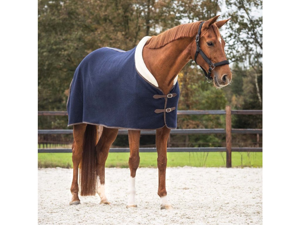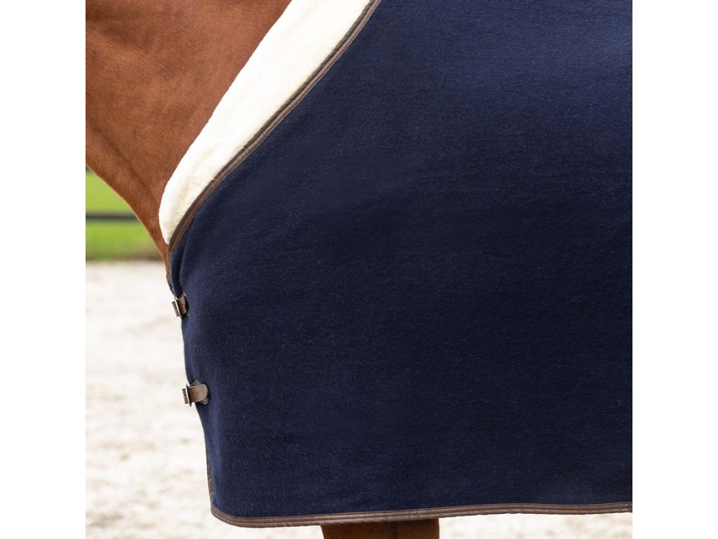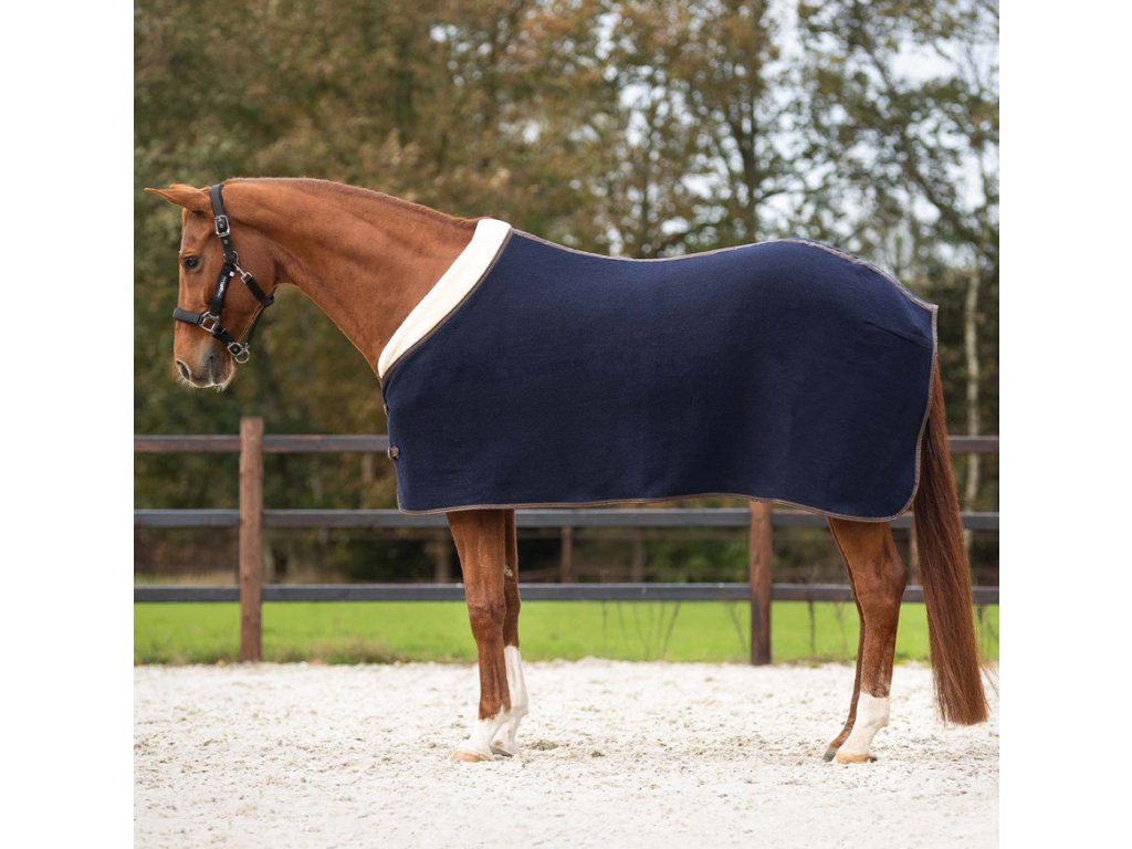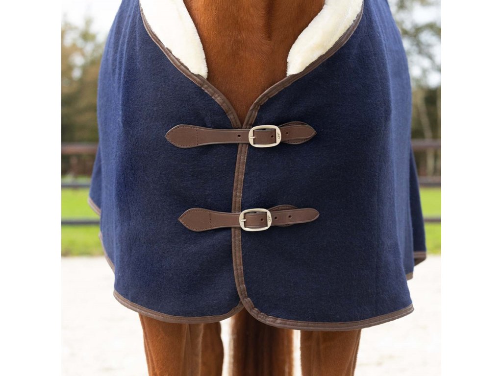 Chłodząca derka wykonana z wysokiej jakości wełny o gramaturze 650 g/m2. Dzięki zastosowanemu materiałowi derka jest oddychająca, szybko wchłania wilgoć i utrzymuje ciepło koni. Wyposażona w syntetyczny kołnierz z wełny, który zapobiega obtarciom w okolicy kłębu. Przednie podwójne zapięcie na klamrę. Przednie zapięcie i krawędź derki są ozdobione sztuczną skórą. Można prać w pralce w specjalnym programie do wełny. Zaleca się stosowanie detergentu do wełny. Nie suszyć w suszarce bębnowej!